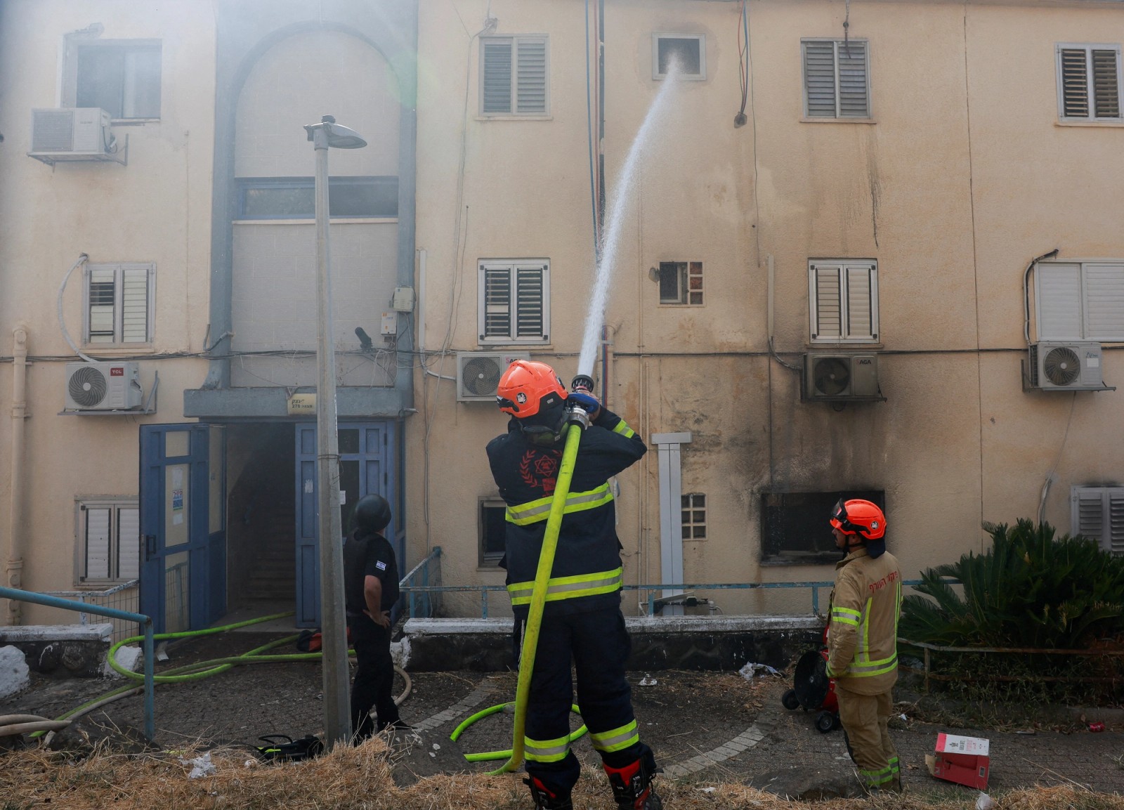 آتش‌نشانان در تلاش برای فرونشاندن حریق در پی حمله حزب‌الله به کیریات شمونا در شمال اسرائیل، ۱۸ مهر