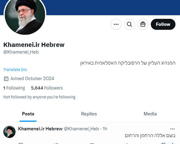 پس از حمله اسرائیل به ایران، حساب دفتر علی خامنهای در ایکس یک صفحه به زبان عبری راهاندازی کرد. این صفحه در اولین پست خود عبارت «بسمالله الرحمن الرحیم» را به زبان عبری نوشت.