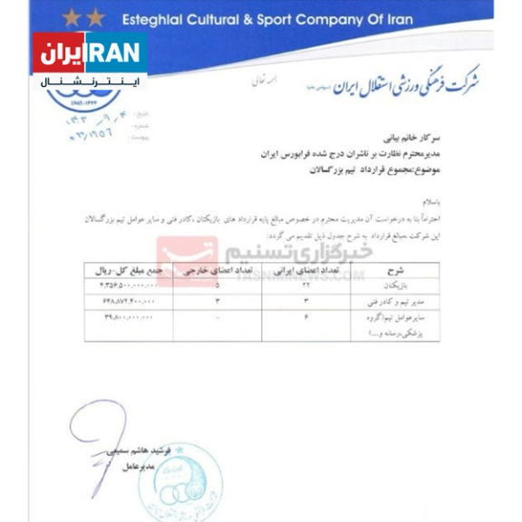 باشگاه استقلال در سامانه کدال اعلام کرد قرارداد بازیکنان و کادر فنی تیم در فصل بیستوچهارم لیگ برتر در مجموع ۵۰۰میلیارد و ۵۳۷میلیون تومان است؛ ۴۳۵ میلیارد و ۶۵۰ میلیون تومان قرارداد ۲۲ بازیکن داخلی و ۵ خارجی و ۶۴ میلیارد و ۸۸۷ قرارداد مدیر تیم و کادرفنی (۳ داخلی و ۳ خارجی) است.