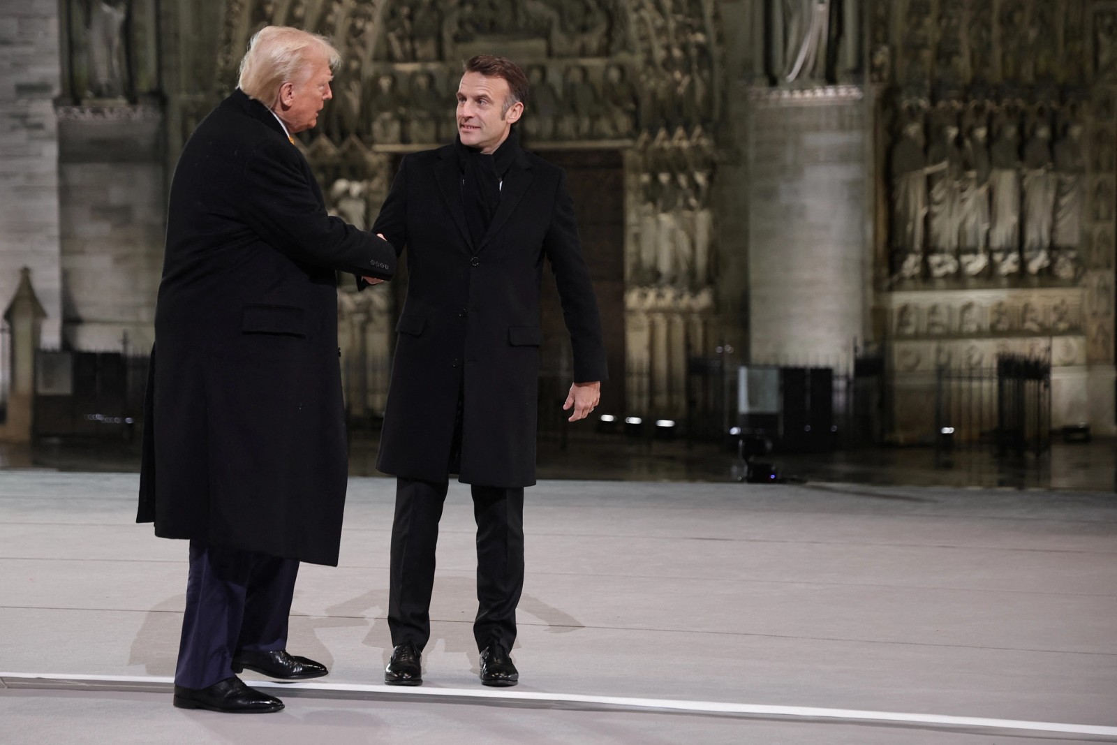 امانوئل مکرون و دونالد ترامپ در مراسم بازگشایی کلیسای نوتردام پاریس، ۱۷ آذر