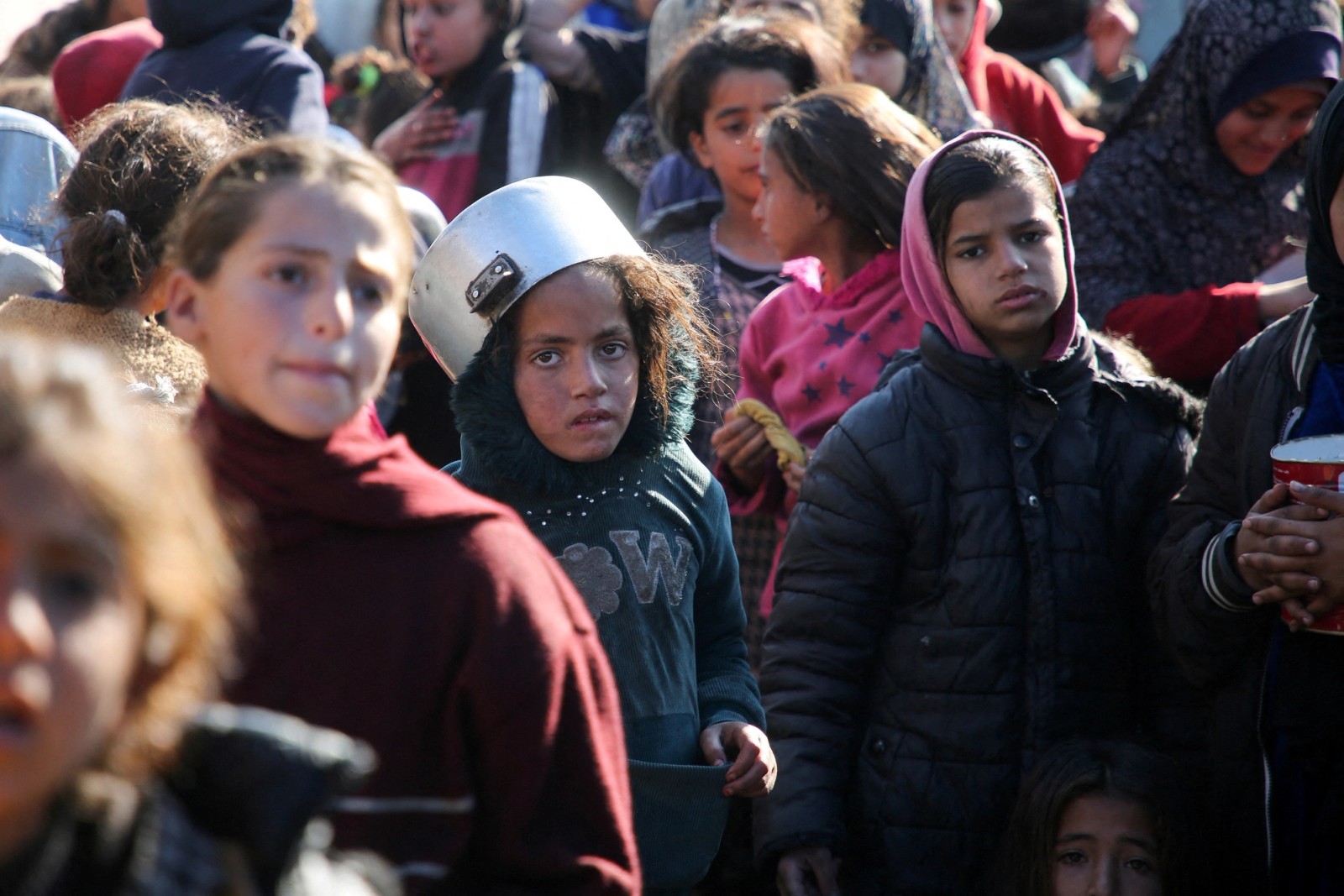 کودکان فلسطینی در صف دریافت غذا، خان یونس در جنوب نوار غزه، ۱۳ دی