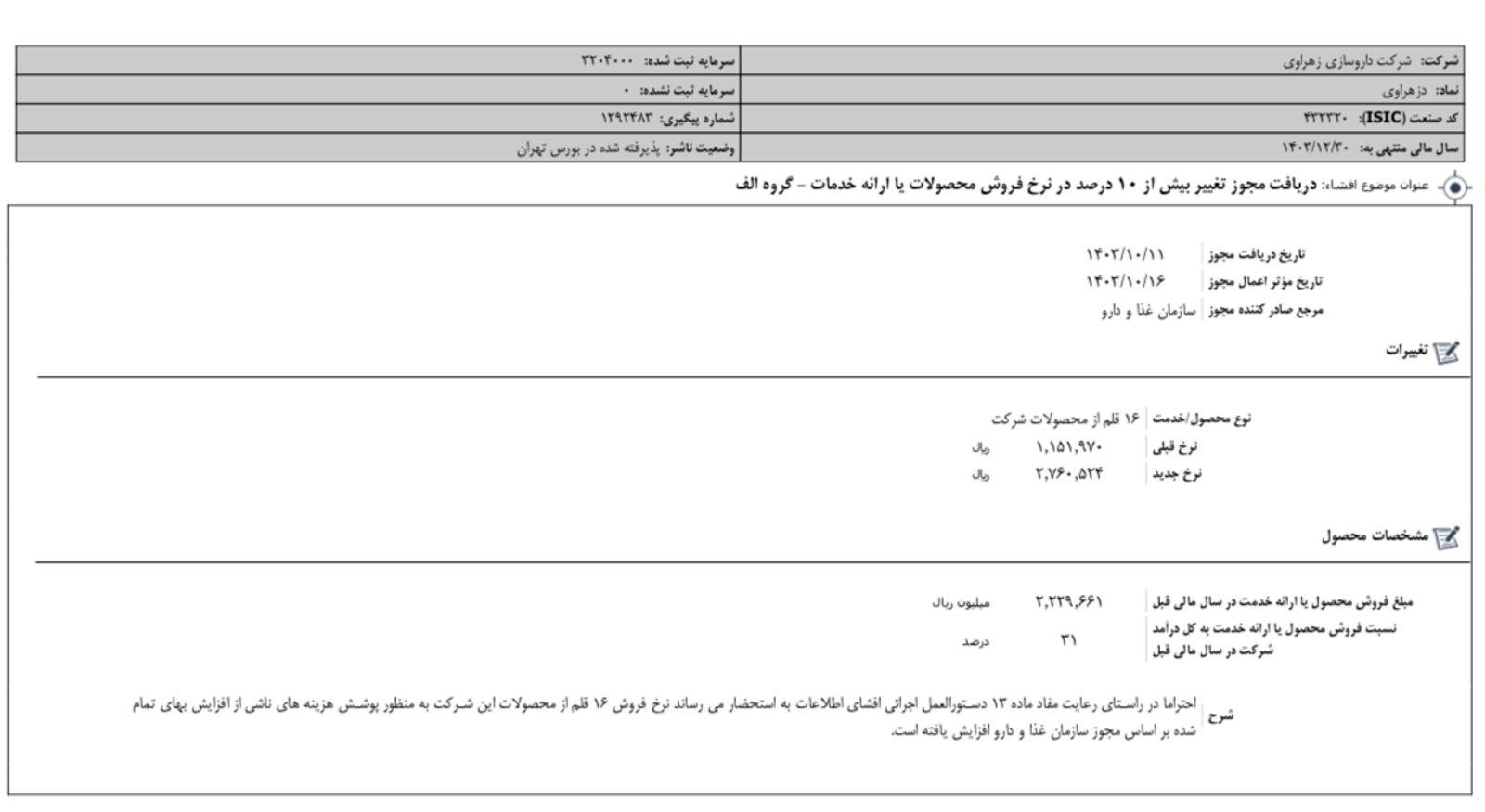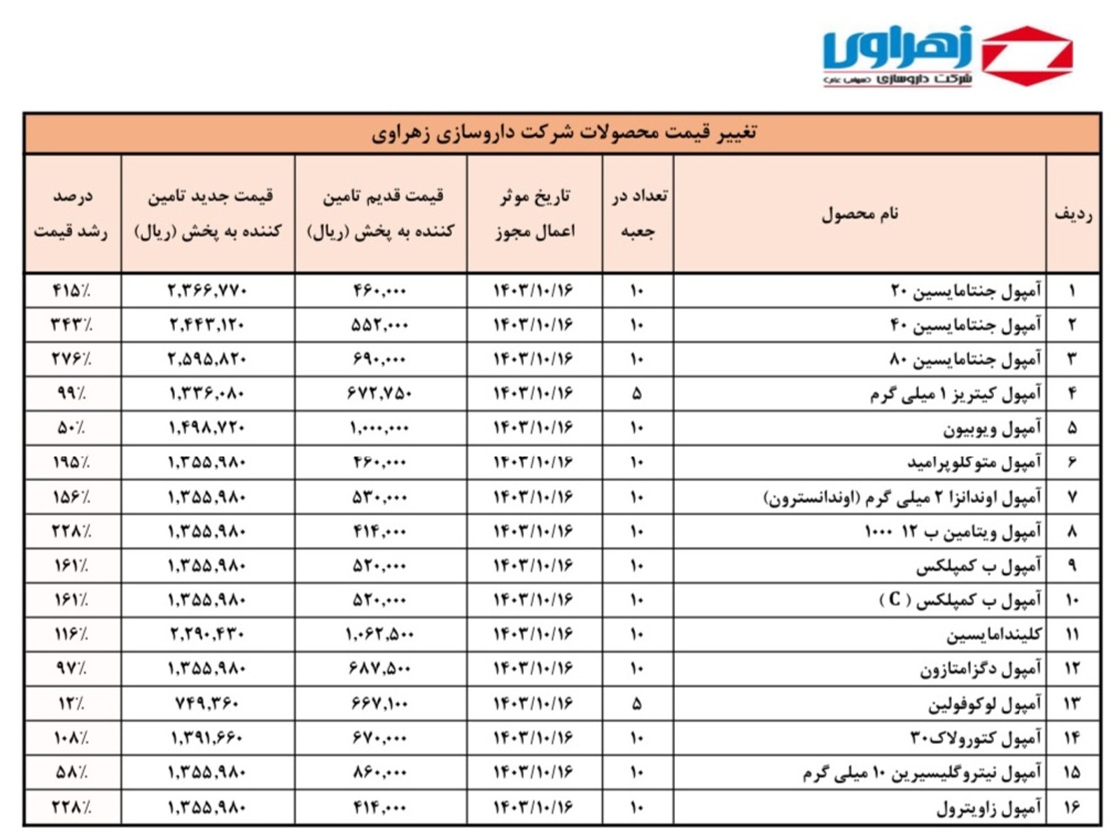شرکت شبه‌دولتی داروسازی زهراوی که متعلق به سازمان تامین اجتماعی، زیرمجموعه وزارت کار، تعاون و رفاه اجتماعی است، با مجوزی که ۱۱ دی‌ ماه ۱۴۰۳ از سازمان غذا و دارو دریافت کرده، قیمت ۱۶ قلم از تولیدات خود را از ۱۲ تا ۴۱۵ درصد افزایش داد.