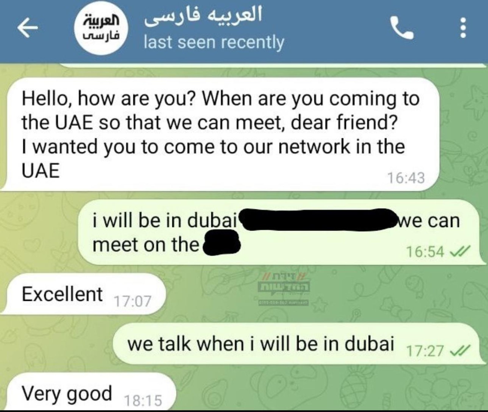 تصویری از چت نیروهای امنیتی جمهوری اسلامی، در پوشش کارکنان شبکه العربیه فارسی با تاجر اسرائیلی