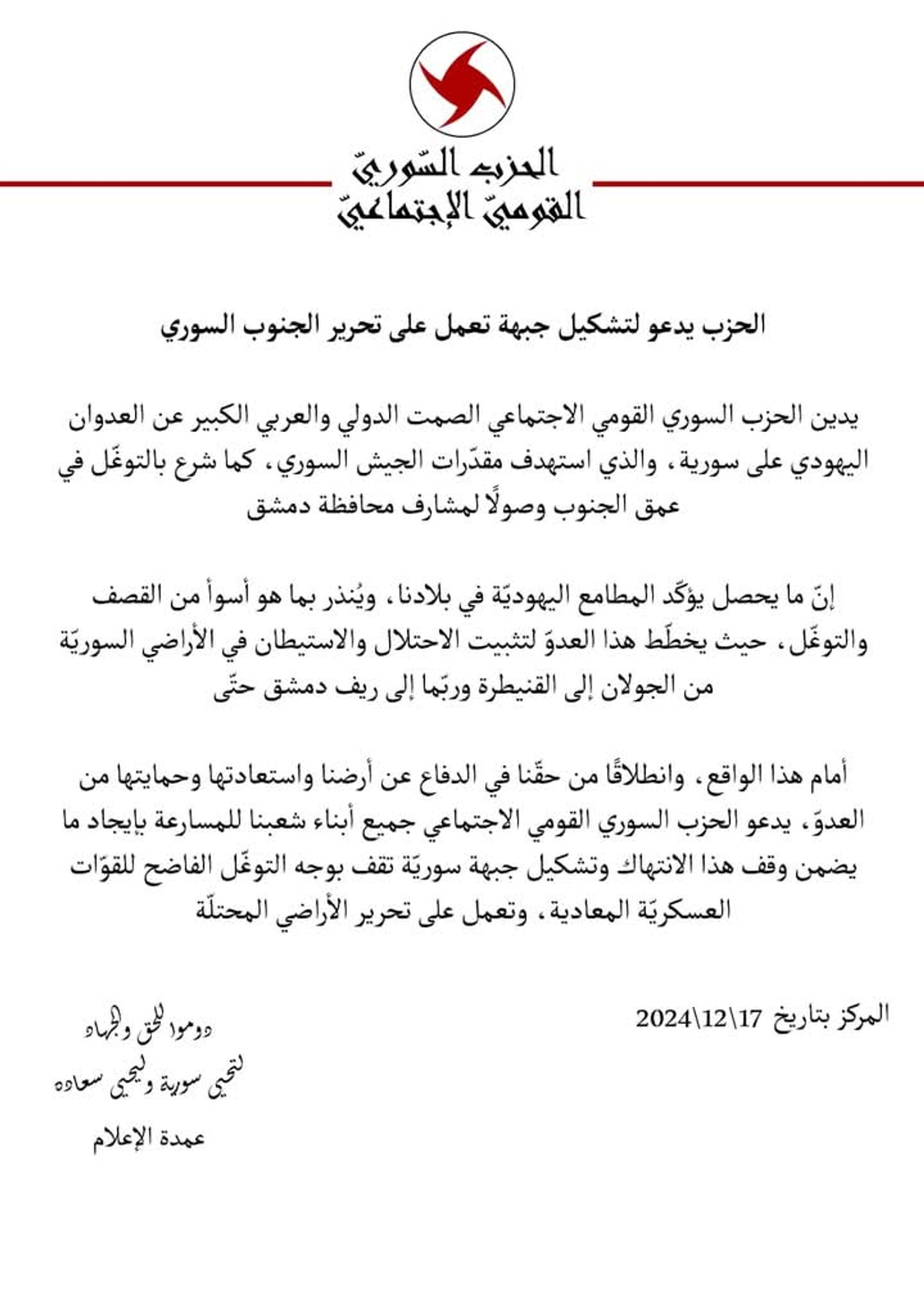 اعلامیه حزب ملی سوسیالیستی سوریه درباره تأسیس«جبهه آزادسازی جنوب»