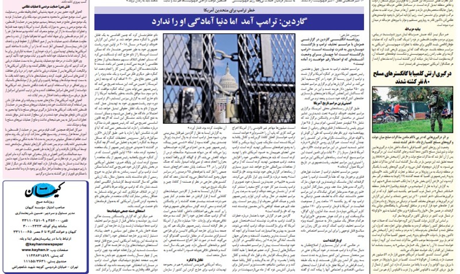 کیهان، روزنامهای که علی خامنهای، رهبر جمهوری اسلامی، مدیرمسئول آن را منصوب میکند، در واکنشی خنثی، به تحلیف ترامپ پرداخت.