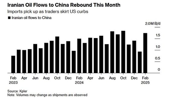 پایگاه خبری بلومبرگ گزارش داد که با دور زدن محدودیت‌های آمریکا از سوی معامله‌گران، صادرات نفت جمهوری اسلامی به چین در ماه میلادی فوریه افزایش یافته است.