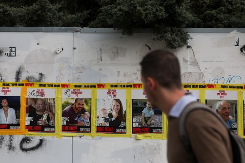 تصاویر شماری از گروگانهای اسرائیلی در بند حماس در خیابانی در اورشلیم، اول اسفند
