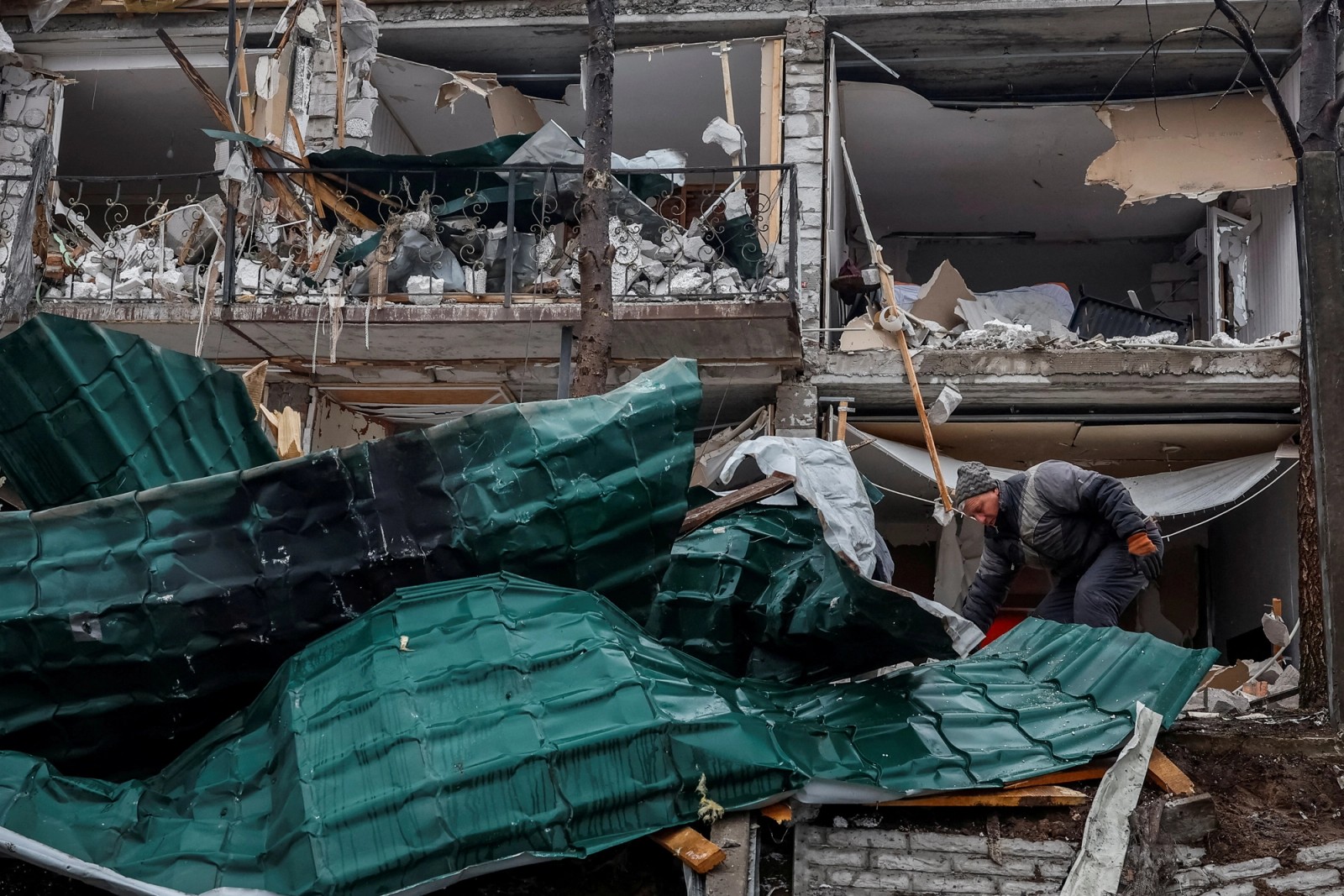 ویرانههای برجا مانده از حمله پهپادی روسیه به حومه کییف، ۲۹ اسفند