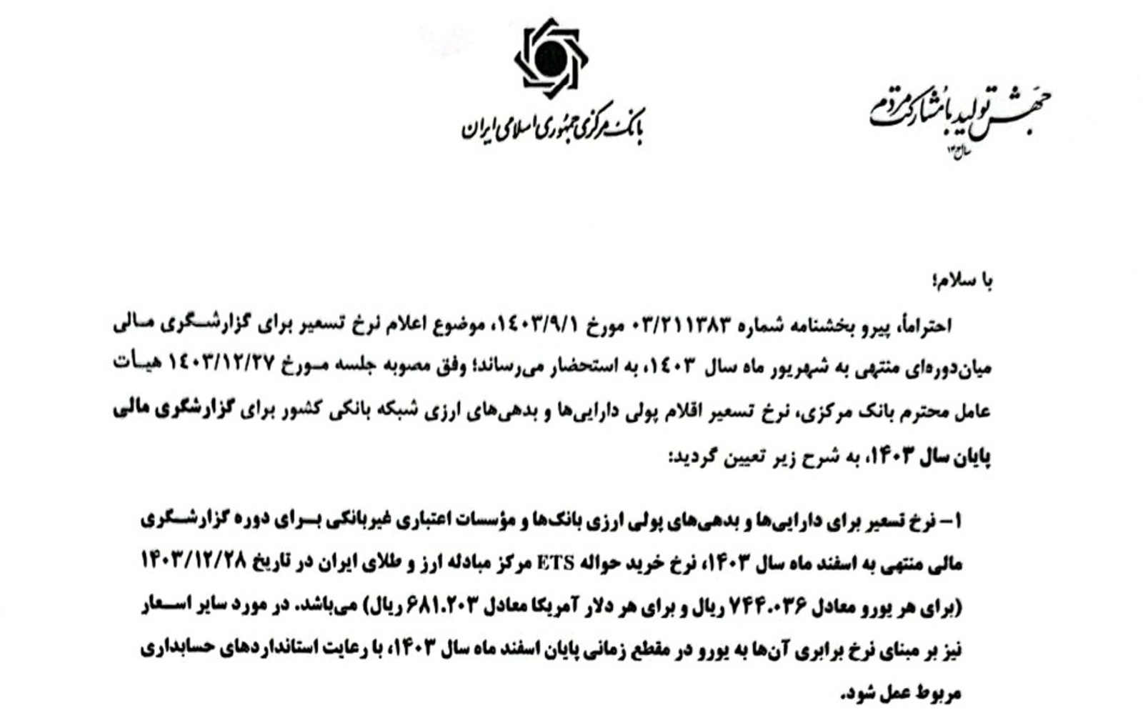این در حالی است که در تاریخ پایان سال مالی منتهی به اسفند ۱۴۰۳، بانک مرکزی نرخ رسمی دلار را حدود ۵۸ هزار تومان و نرخ رسمی یورو را حدود ۶۳ هزار تومان اعلام کرده بود.