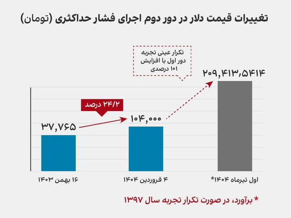 دو ماه پس از صدور فرمان احیای فشار حداکثری به جمهوری اسلامی، قیمت دلار در بازار آزاد تهران به طور متوسط ۲۴.۳ درصد افزایش یافته است؛ مشابه شرایطی که در دور اول فشار حداکثری وجود داشت. ادامه این روند به کجا خواهد کشید؟