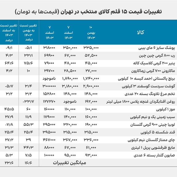 قیمت روغن خوراکی در پی خروج شرکت صافولا از ایران و تصاحب اموال آن از سوی خانواده مدلل، برای مدتی دچار نوسانات شدید شد. همچنین، قیمت پوشک بچه نیز کاهش ۵ درصدی را تجربه کرده است. سایر اقلام این سبد، از ۳ تا ۷۶ درصد افزایش قیمت نسبت به بهمنماه ۱۴۰۳ داشتهاند.