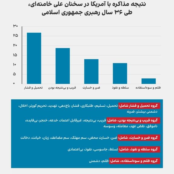 دادههای استخراج شده از ۱۲۱ مورد موضعگیری و اظهار نظر خامنهای در بازه زمانی ۱۳۶۸ تا ۱۴۰۴ و تحلیل محتوای کمی و کیفی، نشان میدهد از مجموع ۳۱ نتیجه ثبتشده در رابطه با «نتیجه مذاکره» در دیدگاه خامنهای، ۳۹ درصد به «تحمیل» با کلیدواژههای «تحمیل، تسلیم، طلبکاری، فشار، باجدهی، تهدید، تحریم کورتر، اخلال، دشمنی بیشتر و ضربه» اشاره دارد که نشان میدهد رهبر جمهوری اسلامی به اینکه مذاکره با آمریکا به فشار و اجبار منجر میشود، باور عمیق دارد.