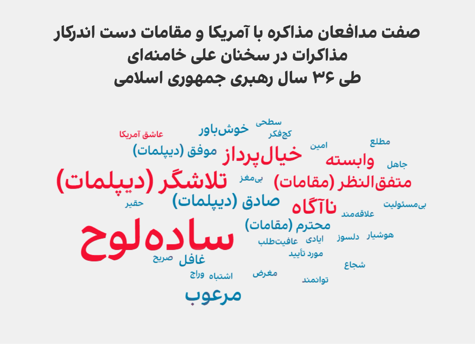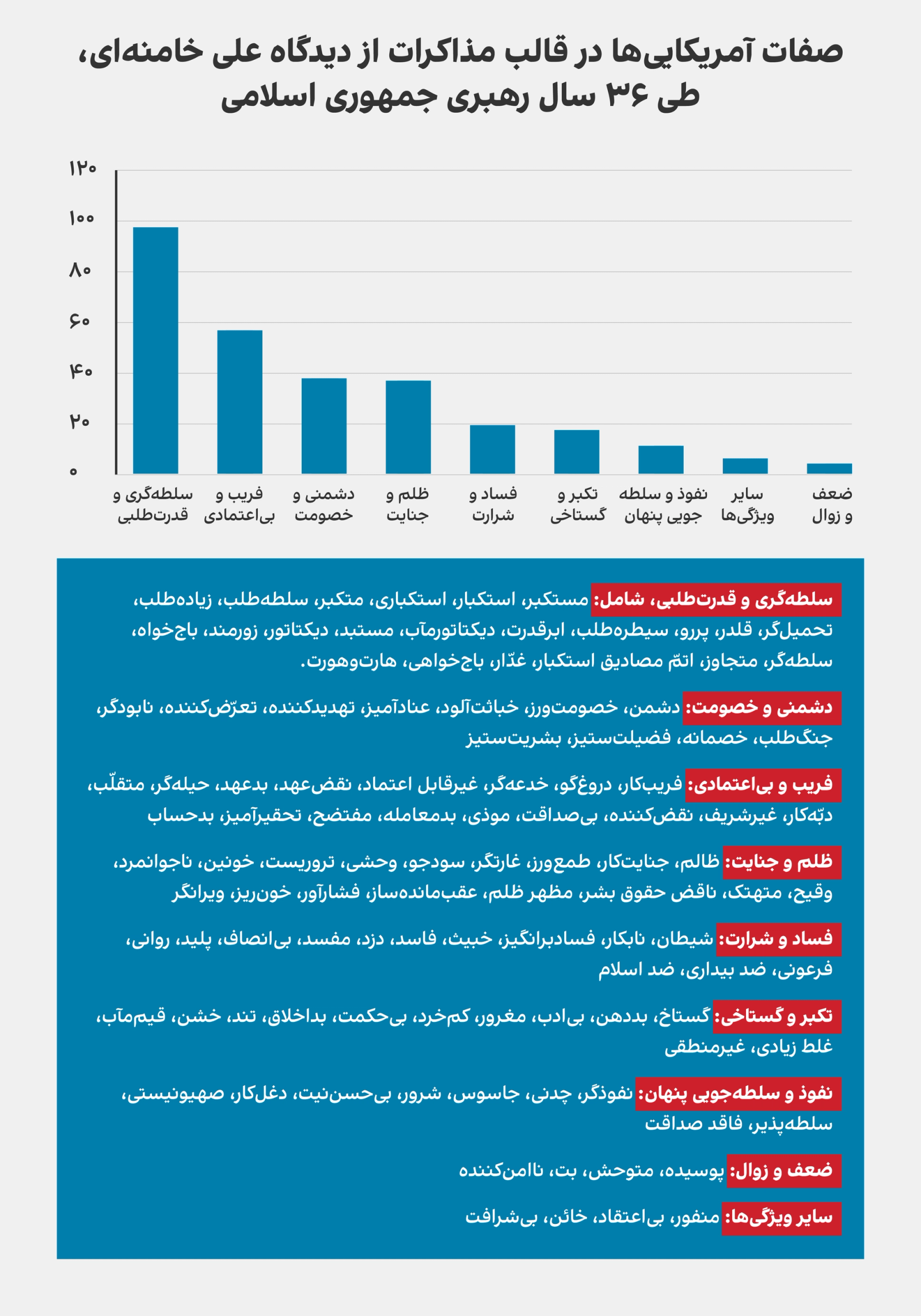 بررسی روند گروه‌های صفت‌ آمریکایی‌ها در مذاکرات و پیش‌بینی و اظهار نظر درباره نتایج، نشان می‌دهد که نگاه رهبر جمهوری اسلامی در دوره‌های مذاکره مانند ۱۳۹۲و ۱۳۹۴ و تنش‌های شدید مانند ۱۳۹۸ منفی‌تر می‌شود.