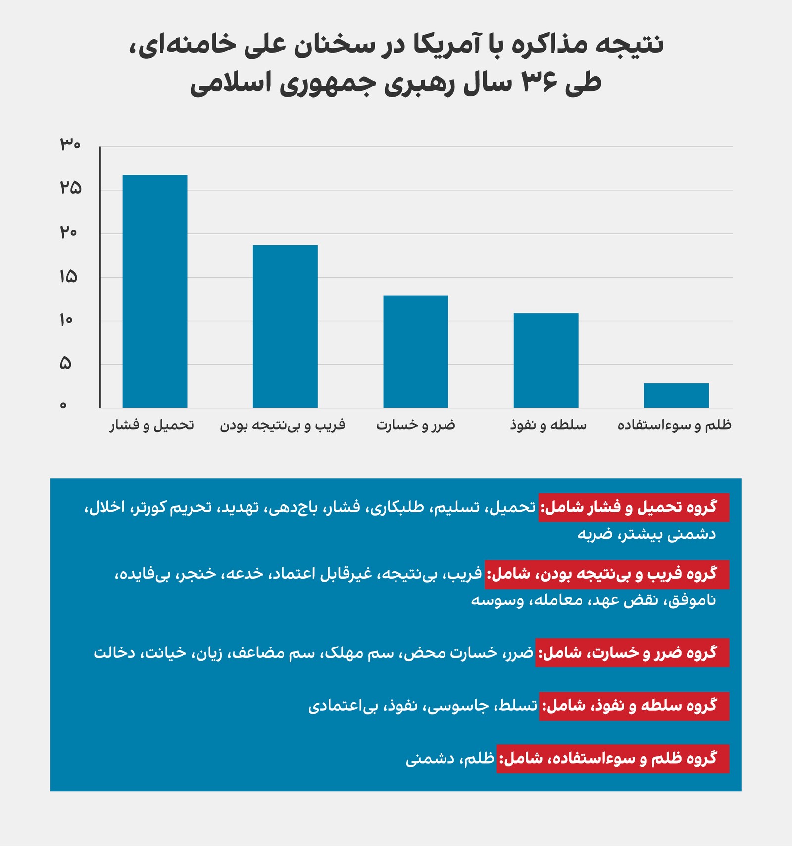 ۲۶ درصد از نتایج به گروه «ضرر» با کلید‌واژه‌های «ضرر، خسارت محض، سم مهلک، سم مضاعف، زیان، خیانت و دخالت» اشاره دارد که بیانگر باور رهبر جمهوری اسلامی به ضرر در مذاکره با آمریکاست.