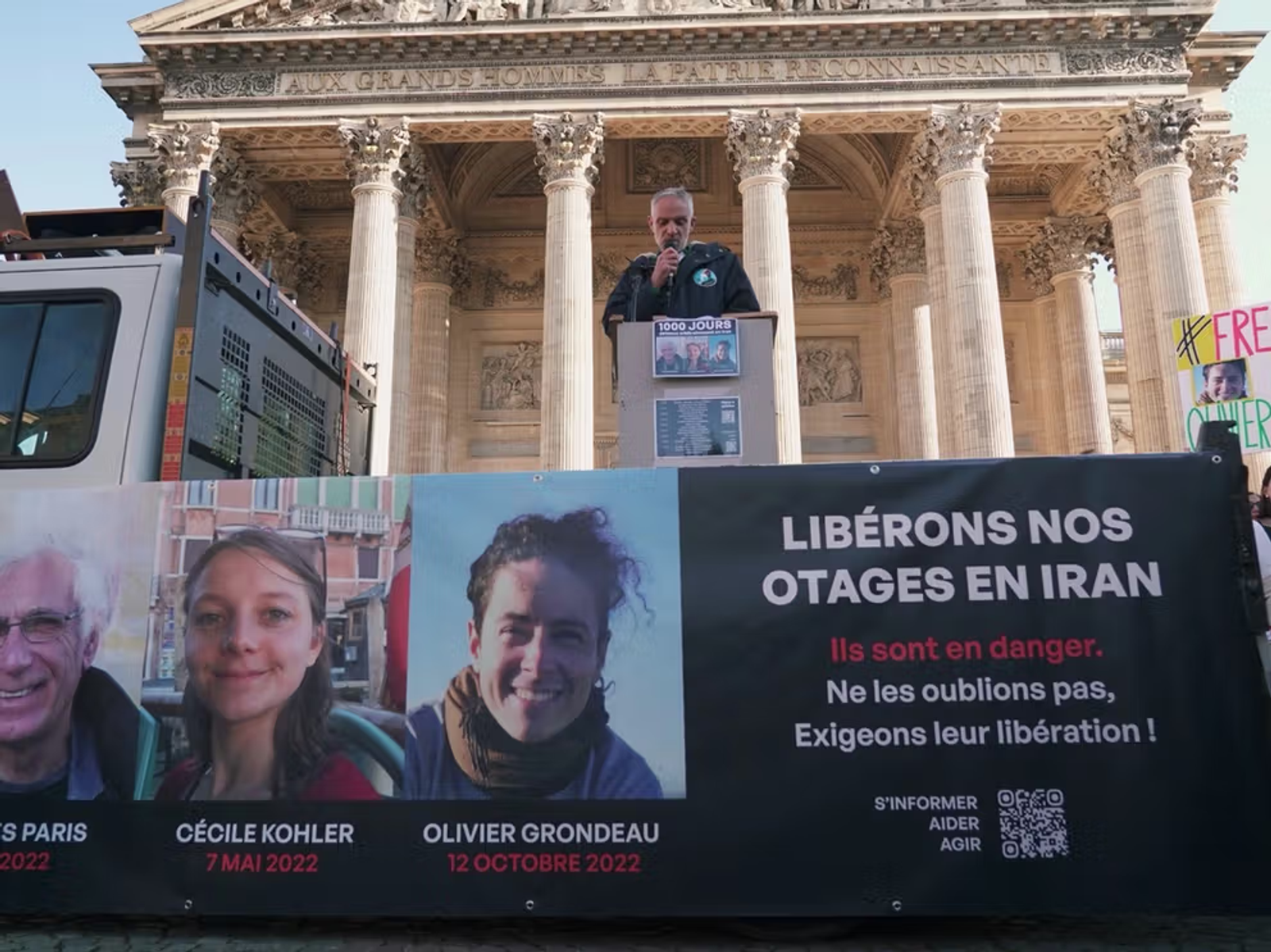 تجمع اعتراضی در واکنش به ادامه بازداشت سه شهروند فرانسوی، از جمله کوهلر و پاریس در ایران/ پاریس، بهمن‌ماه ۱۴۰۳