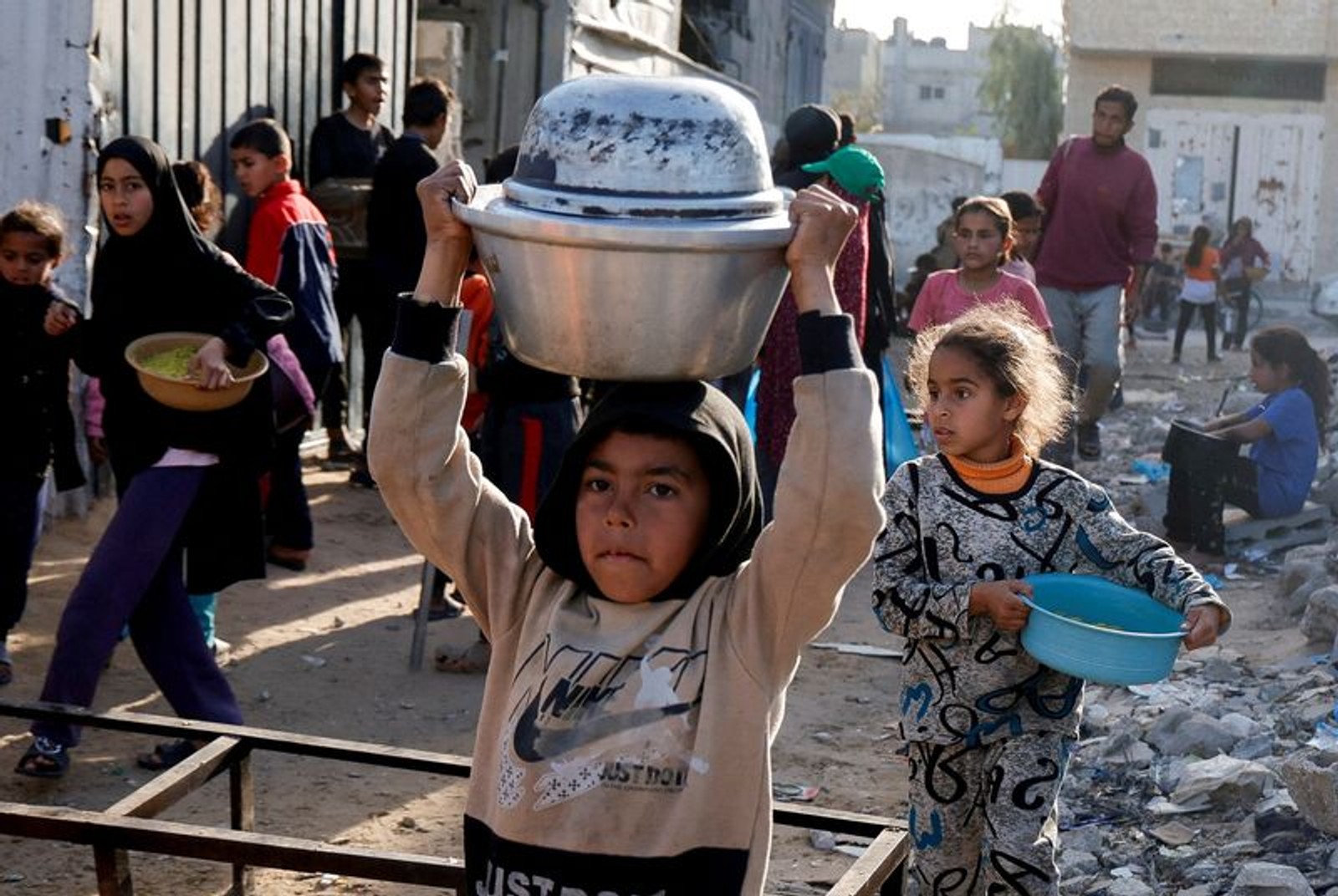 فلسطینیان در صف دریافت غذا در خان یونس، جنوب نوار غزه، ۹ اردیبهشت