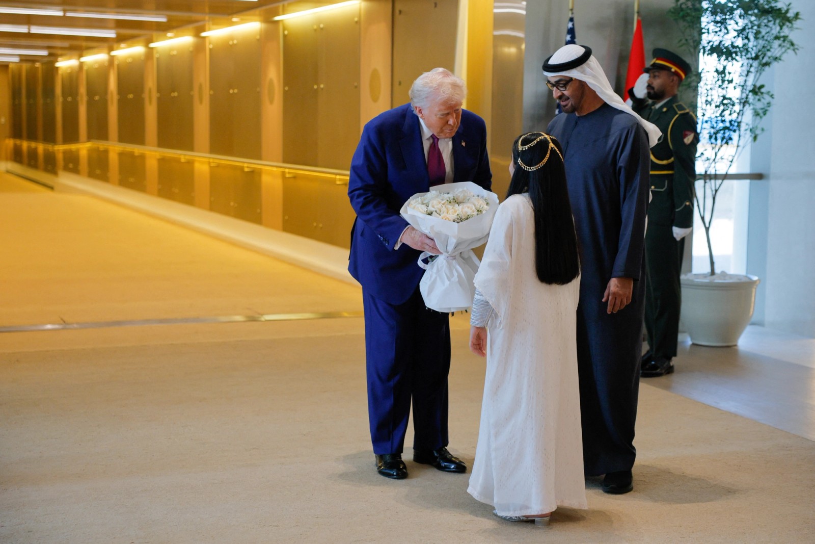در فرودگاه بینالمللی شیخ زاید، محمد بن زاید آل نهیان، رییس امارات، از ترامپ استقبال کرد و به او دستهگل اهدا شد.