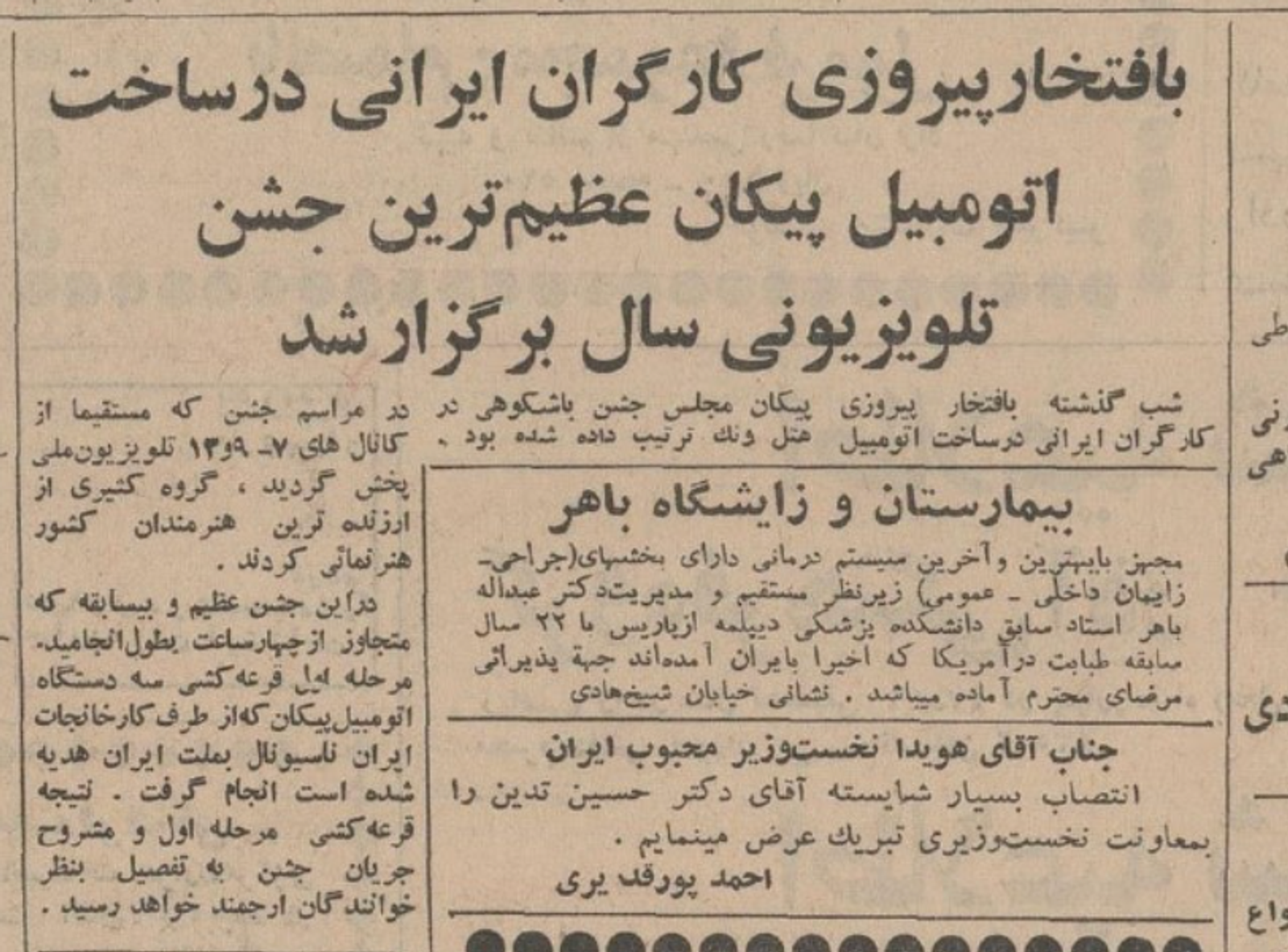 دی ۱۳۴۶، امیر کویت در سفر به ایران، از خط تولید پیکان دیدن کرد. در این دیدار خیامی از توان ایرانناسیونال برای تامین نیاز خاورمیانه خبر داد. / روزنامه اطلاعات ۲۳ دی ۱۳۴۶، صفحه ۱۷