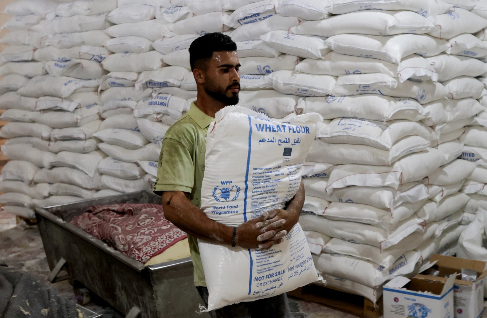 ورود محموله‌های آرد برنامه جهانی غذا به شهر دیر البلح در مرکز نوار غزه، اول خرداد