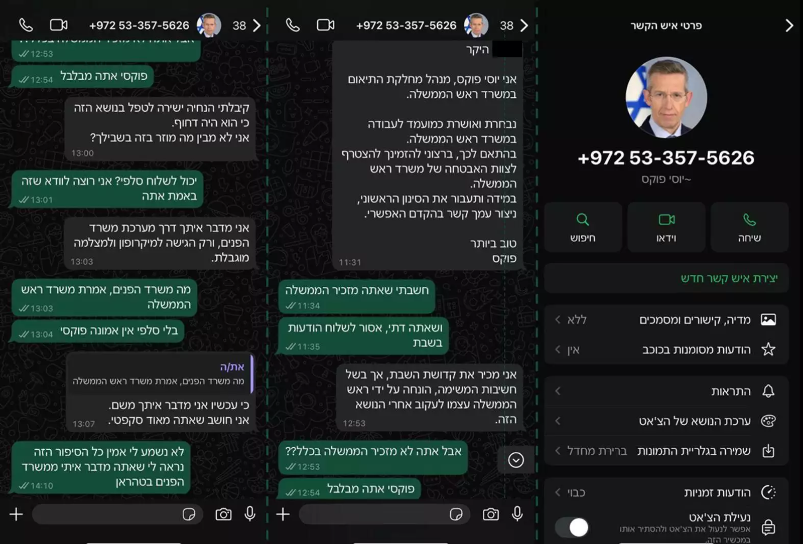 تصویری از تلاش یک عامل ایرانی با جعل هویت یوسی فوکس در گفتوگو با یک شهروند اسرائیلی