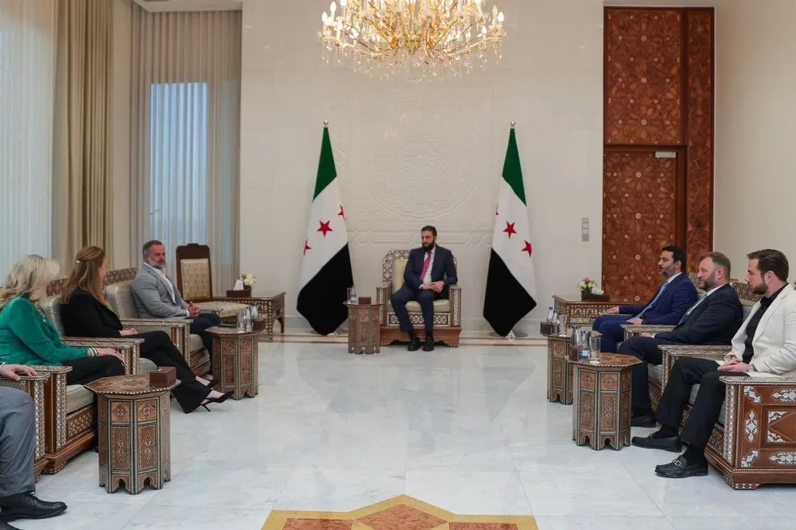 کوری میلز، نماینده جمهوری‌خواه کنگره و احمد الشرع، رییس‌جمهوری موقت سوریه، دمشق، فروردین ۱۴۰۴