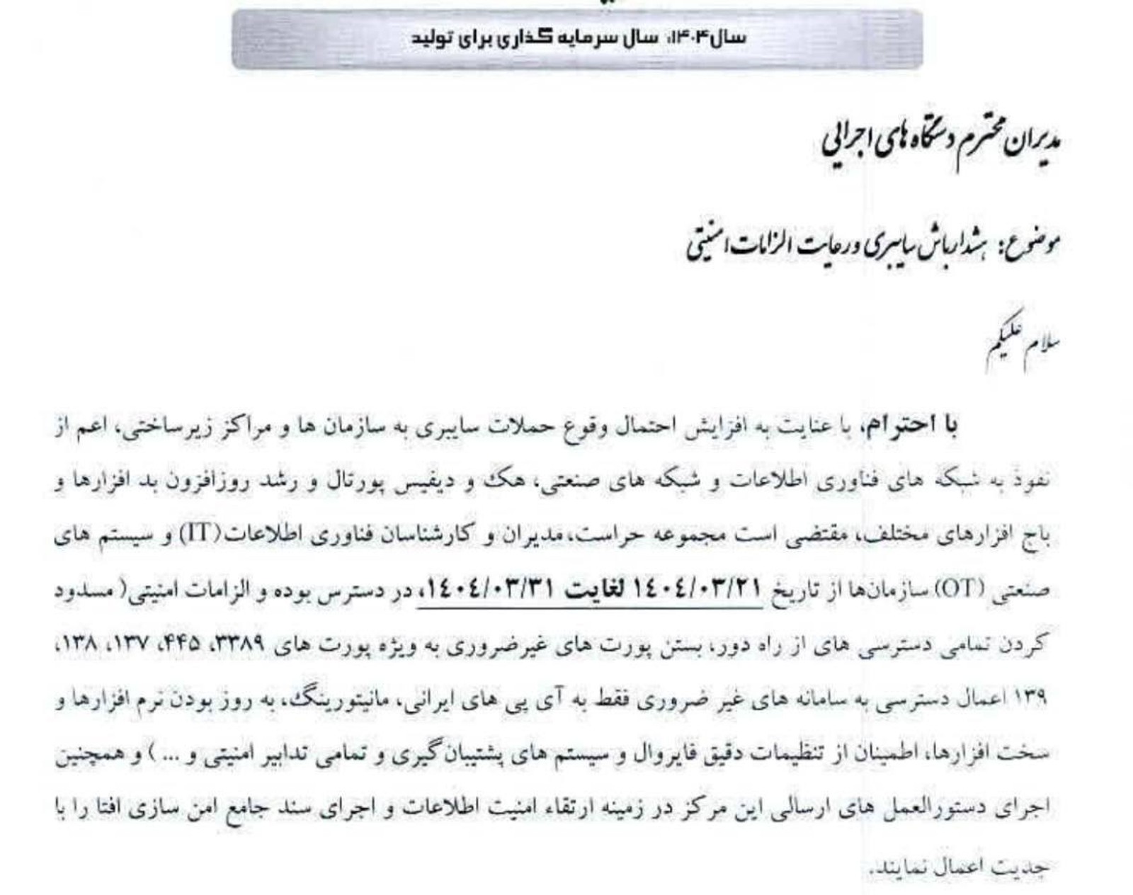 بر اساس این نامه، احتمال وقوع حملات سایبری به سازمان‌ها و مراکز زیرساختی جمهوری اسلامی افزایش یافته است.