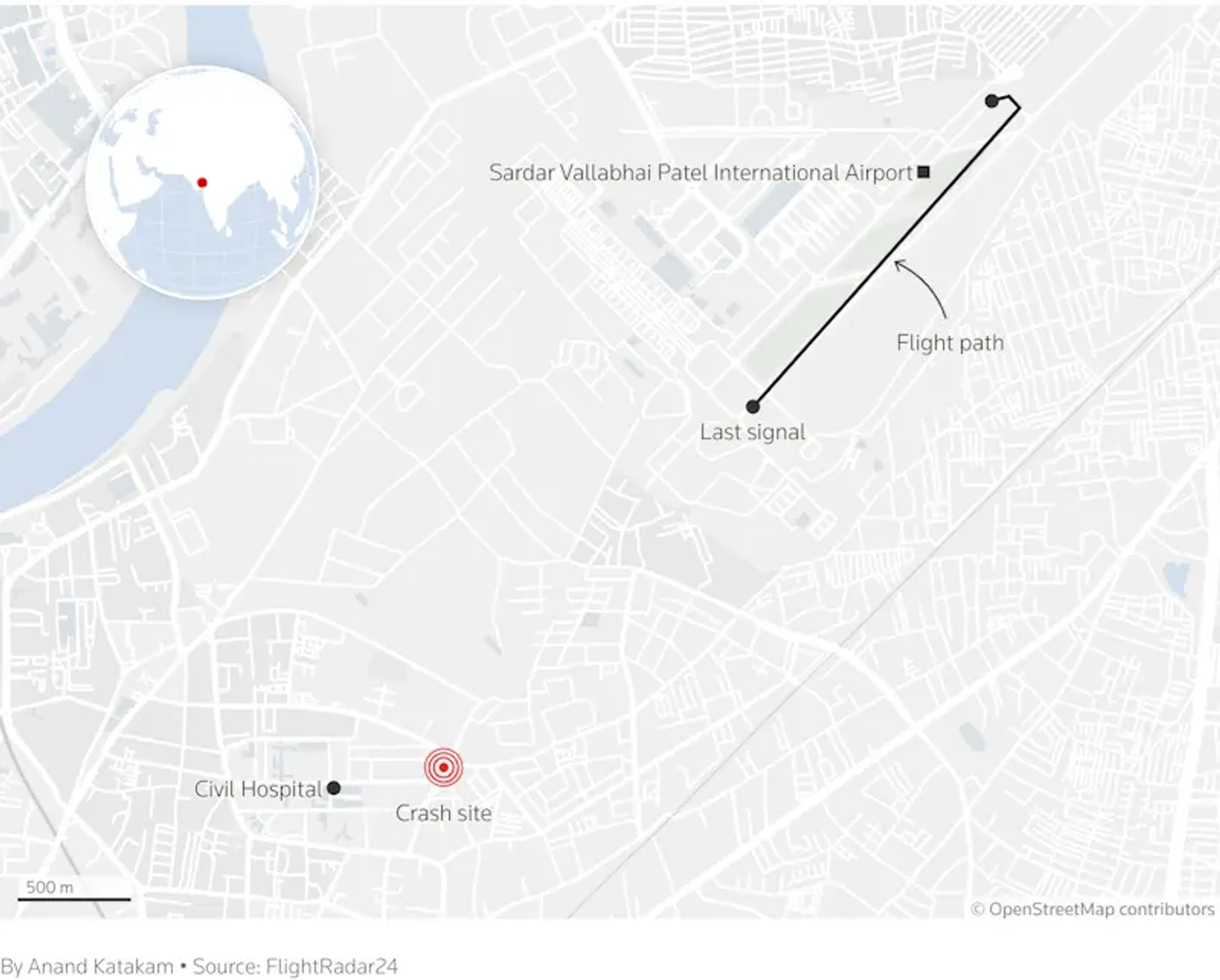 بر اساس گزارش رسانههای هند، این هواپیما از باند ۲۳ فرودگاه احمدآباد در ساعت ۱۳:۳۹ به وقت محلی (۰۸:۰۹ به وقت گرینویچ) پرواز کرده و پس از اعلام وضعیت اضطراری، ارتباط با آن قطع شده است.