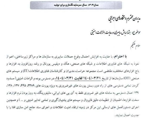 بر اساس این نامه، احتمال وقوع حملات سایبری به سازمانها و مراکز زیرساختی جمهوری اسلامی افزایش یافته است.