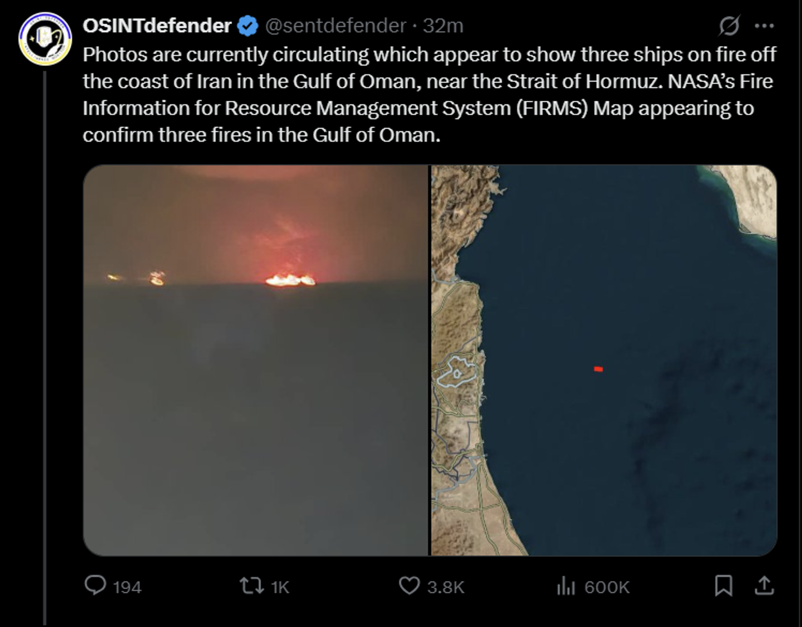 حساب ایکس OSINTdefender هم نوشت: تصاویری در حال حاضر در حال انتشار است که به نظر میرسد سه کشتی را در حال سوختن در سواحل ایران، در دریای عمان، نزدیک تنگه هرمز نشان میدهد. نقشه سیستم اطلاعات آتشسوزی ناسا برای مدیریت منابع نیز وجود سه آتشسوزی را در دریای عمان تایید میکند.