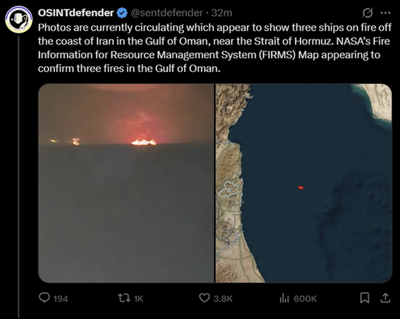 حساب ایکس OSINTdefender در خبری نوشت: به نظر میرسد آتشسوزیهای مشاهده شده در سواحل ایران در دریای عمان، ممکن است ناشی از برخورد دو نفتکش به نامهای «اَدالین» (با پرچم آنتیگوا و باربودا) و «فرانت ایگل» (با پرچم لیبریا) بوده باشد.