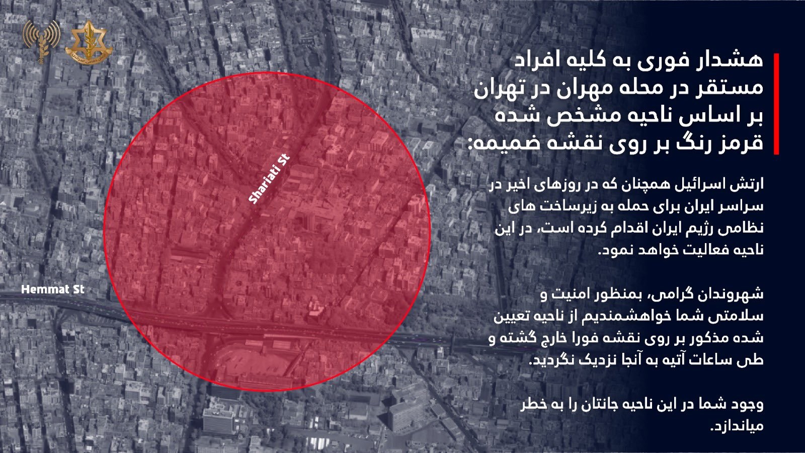 ارتش اسرائیل با صدور هشدار فوری از کلیه افراد مستقر در نواحی مهران و منطقه ۶ در تهران خواست، این منطقه را تخلیه کنند.