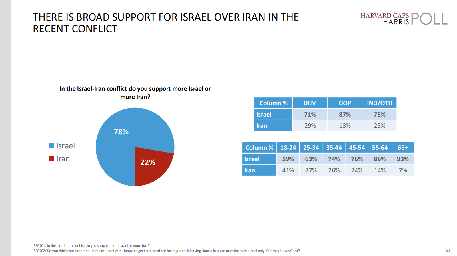 این نظرسنجی حاوی چهار پرسش درباره مناقشه میان حماس و اسراییل است. ۷۷ درصد پاسخدهندگان در این مناقشه حامی اسراییلاند و ۸۰ درصد از آنها معتقدند «حماس باید بیهیچ قید و شرطی تمام گروگانهای باقی مانده را آزاد کند یا با عواقبی جدی روبهرو شود».