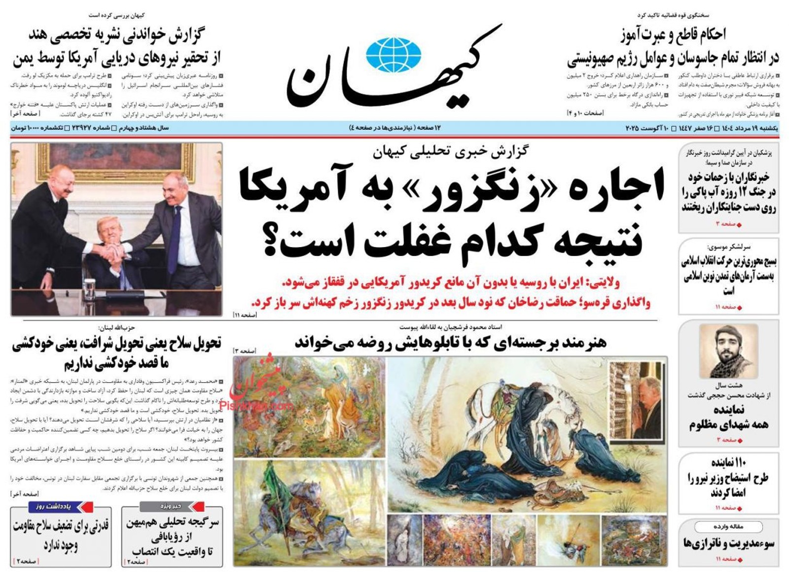 روزنامه کیهان، منسوب به خامنه‌ای در گزارش اصلی شماره یکشنبه ۱۹ مرداد خود نوشت: جمهوری اسلامی، «چه با همراهی روسیه و چه بدون آن» در برابر هرگونه طرح ضدایرانی نظیر زنگزور، واکنشی قاطع و بازدارنده خواهد داشت.