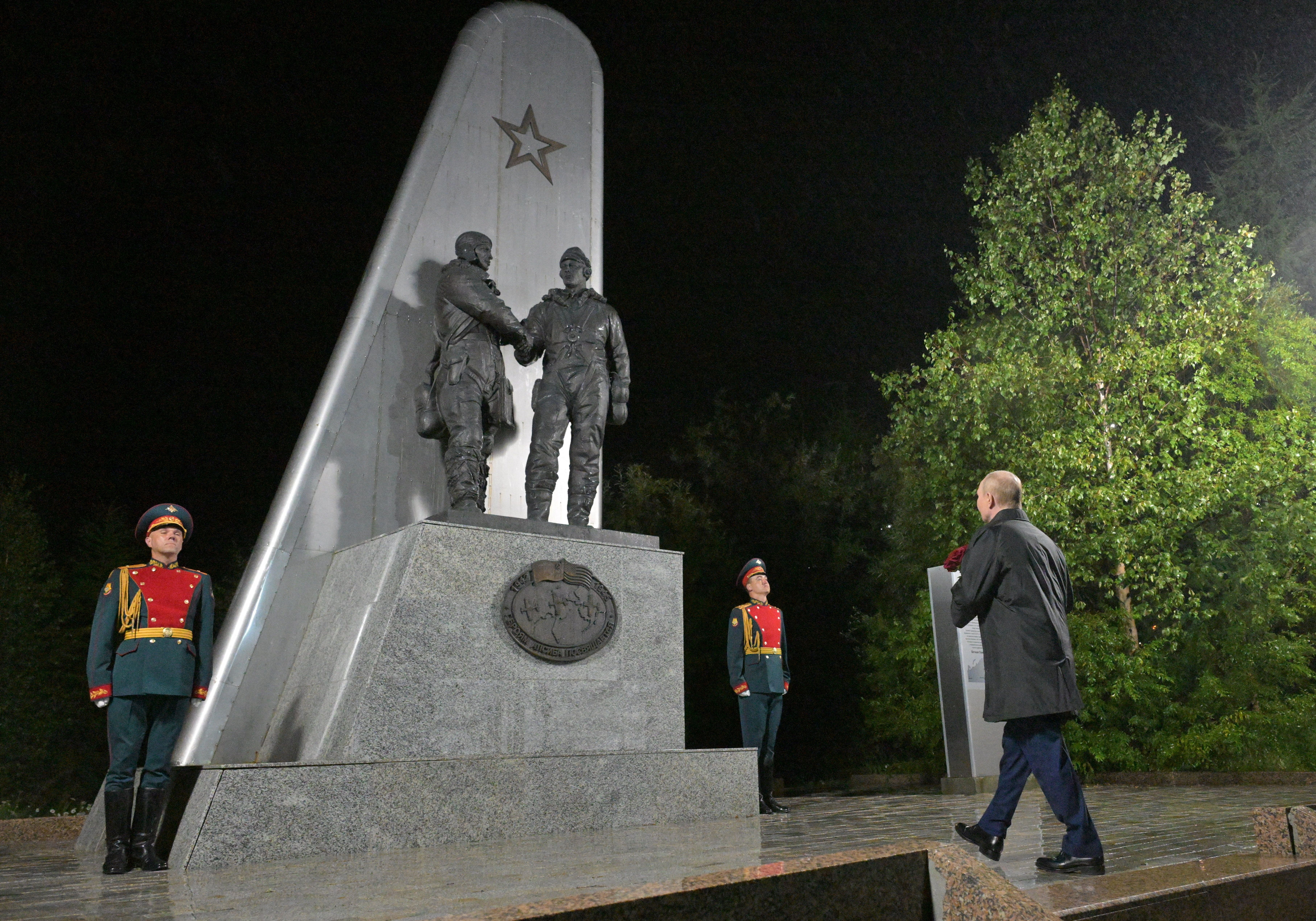 ولادیمیر پوتین، رییسجمهور روسیه، در شهر ماگادان در خاور دور روسیه، گلهایی بر یادبودی گذاشت که همکاری آمریکا و شوروی در طول جنگ جهانی دوم را گرامی میدارد.