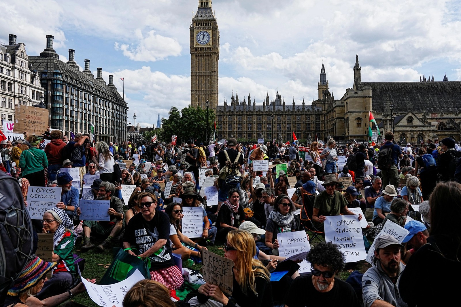 در تظاهرات ۱۵ شهریور در نزدیکی پارلمان بریتانیا، تجمع‌کنندگان پلاکاردهایی در دست داشتند که روی آن نوشته شده بود: «من با نسل‌کشی مخالفم. از اقدام برای فلسطین حمایت می‌کنم.»