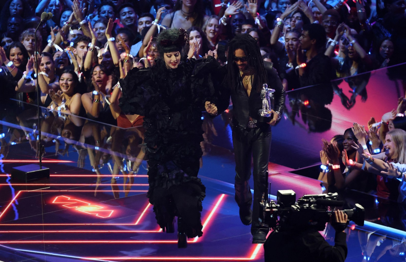 گاگا که در حال اجرای تور با آلبوم «Mayhem» است، در حالیکه لباس مشکی با آستینهای بزرگ و جزئیات بنفش به تن داشت، روی صحنه رفت و هنگام دریافت تندیس از هوادارانش تشکر کرد.