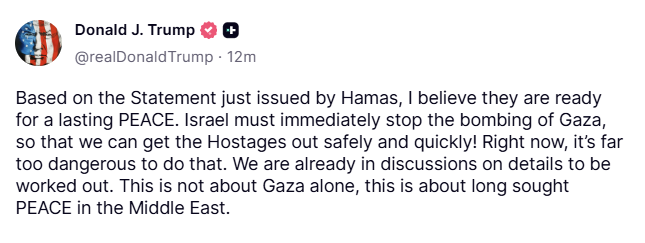دونالد ترامپ، رییس جمهوری آمریکا در پستی در تروث سوشال نوشت بر این باور است که بر اساس بیانیهای که حماس بهتازگی منتشر کرده است، این گروه آماده دستیابی به صلحی پایدار است.