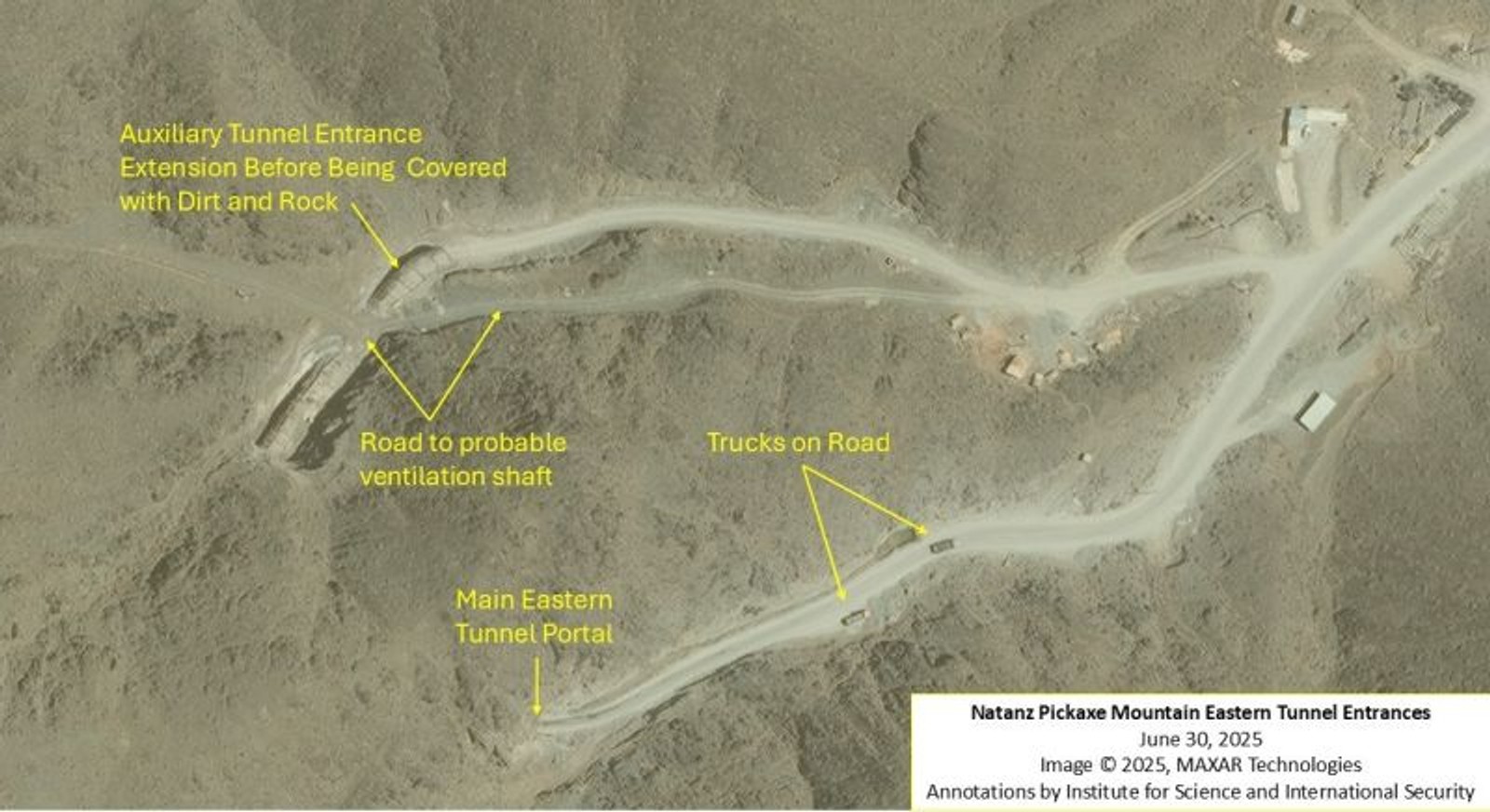 براساس این گزارش، تصاویر ماهواره‌ای ۱۰ اوت ۲۰۲۵ از شرکت مکسار نشان می‌دهد ورودی‌های تاسیسات تونلی قدیمی‌تر که از سال ۲۰۰۷ ساخته شده بودند، با پوشش ضخیم بتنی تقویت و سپس با خاک پوشانده می‌شوند. این اقدام آشکارا با هدف مقاوم‌سازی در برابر حملات هوایی یا خرابکاری انجام می‌شود.
