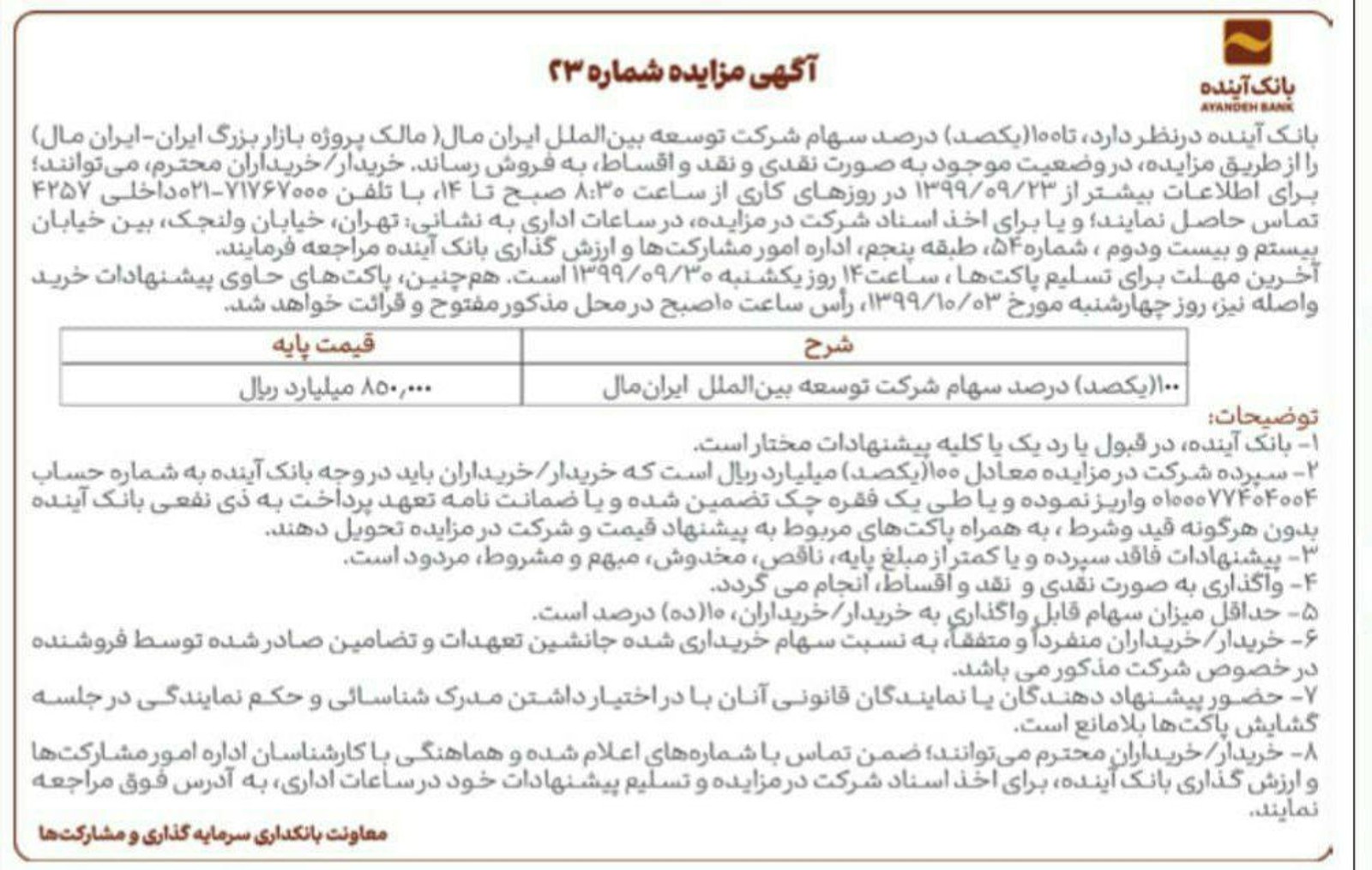 علی انصاری از سال ۱۳۹۹ در تلاش است ایرانمال را به فروش برساند. اما مشتری برای آن وجود ندارد./ آگهی مزایده مربوط به سال ۱۳۹۹