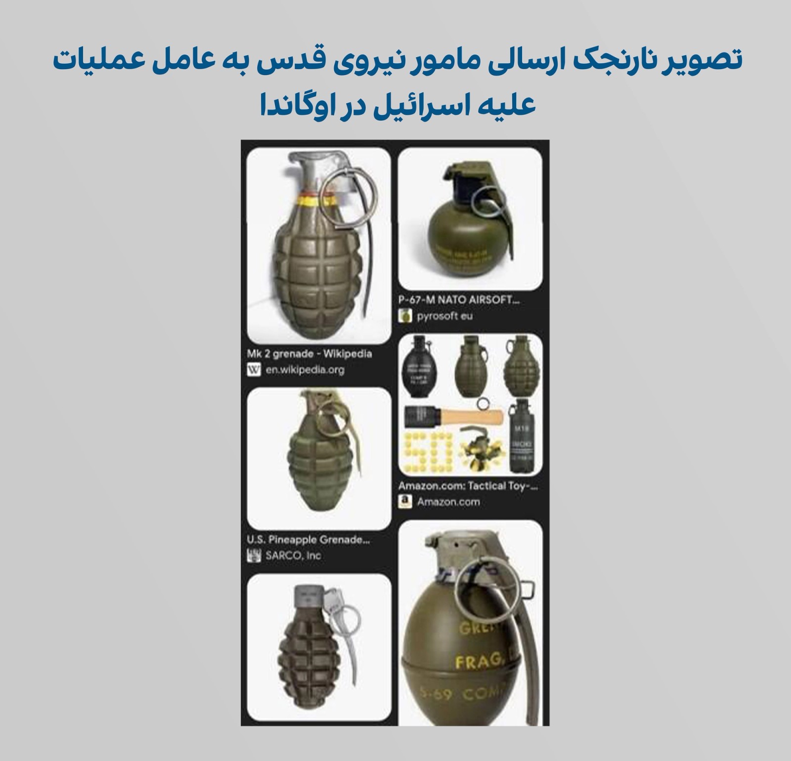 یک عضو ایرانی شبکه نیروی قدس فعال در برنامه حمله به سفارخانههای اسرائیل در اوگاندا و سنگال، تصویری از یک نارنجک را در واتساپ برای عامل اوگاندایی فرستاد و از او خواست چنین سلاحی را خریداری کند.