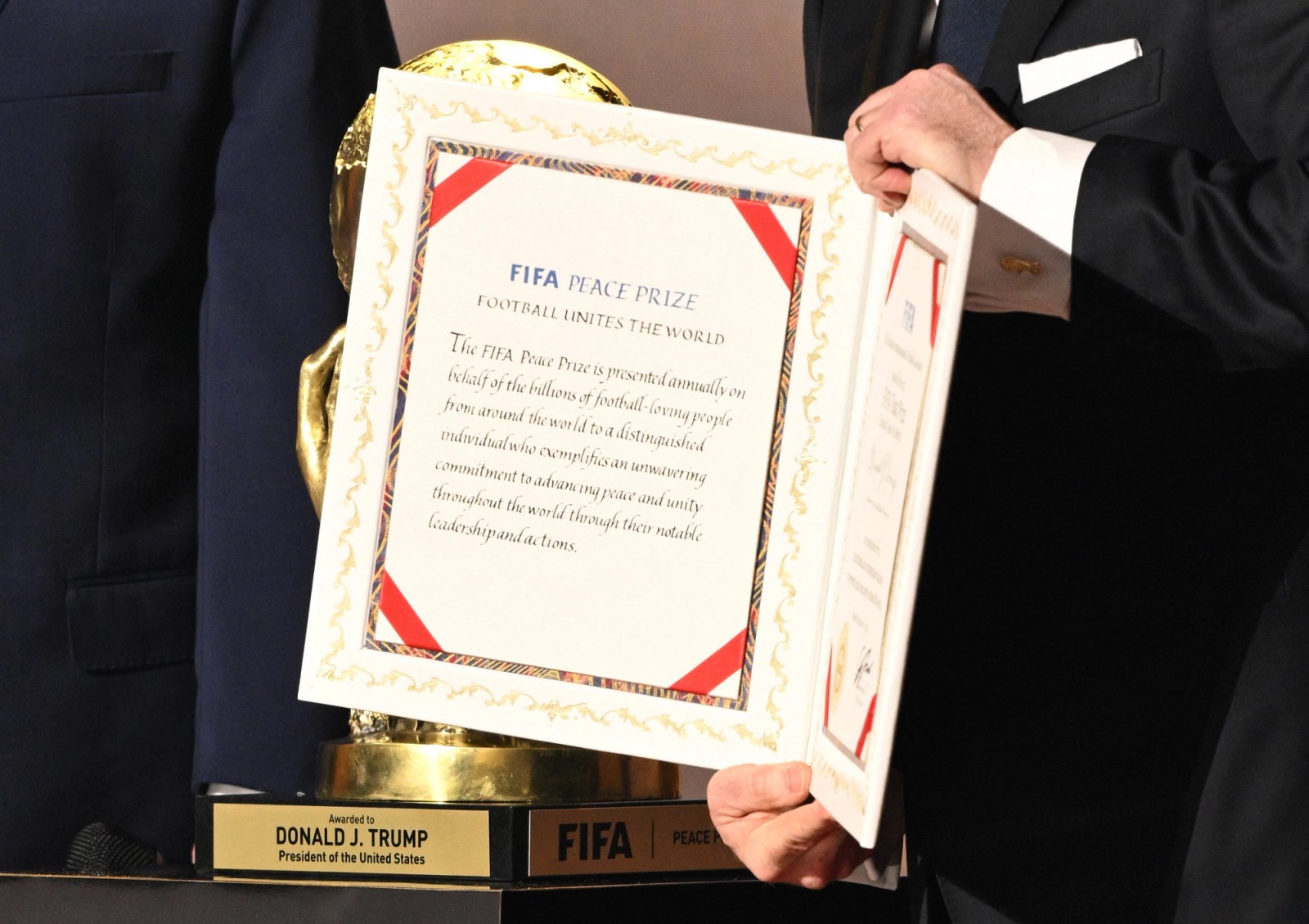 دونالد ترامپ، رییس‌جمهوری ایالات متحده آمریکا، نخستین جایزه صلح فیفا را در مراسم قرعه‌کشی جام جهانی ۲۰۲۶ فوتبال دریافت کرد.