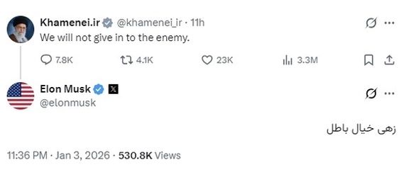 ایلان ماسک، میلیارد آمریکایی و از حامیان دونالد ترامپ، در واکنش به پست انگلیسی علی خامنهای در شبکه ایکس به فارسی نوشت: «زهی حیال باطل».