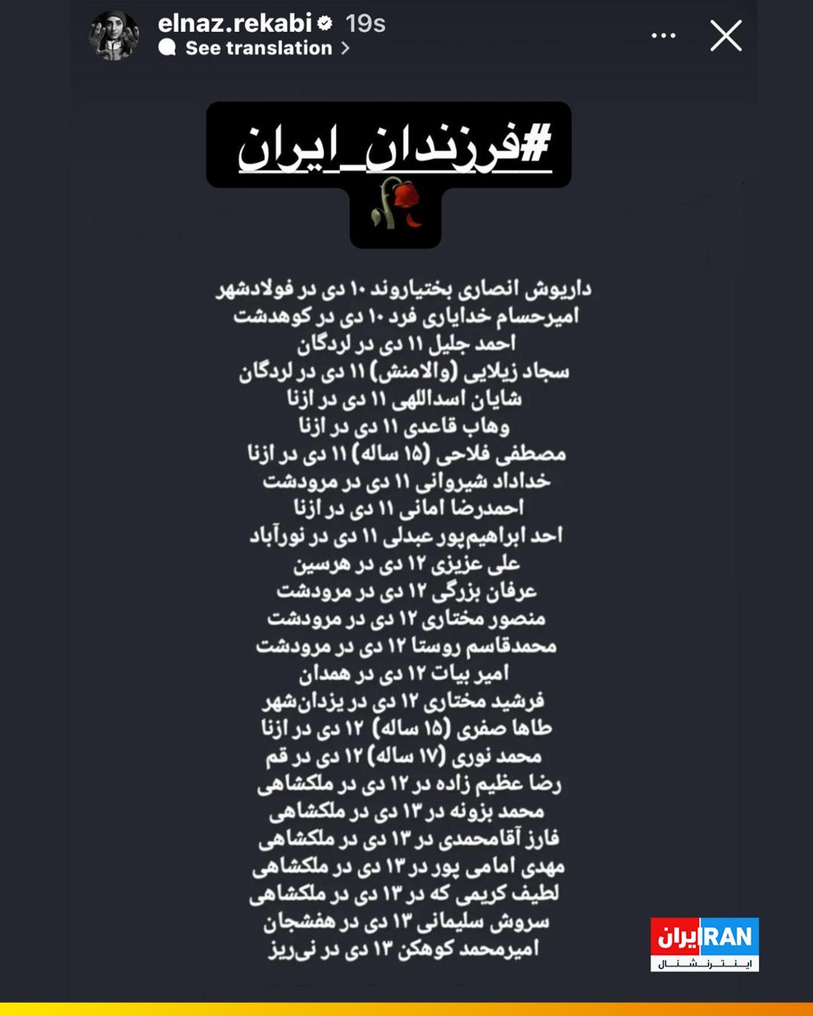 الناز رکابی، سنگنورد ایرانی با انتشار اسامی کشته شدگان خیزش مردمی در یک استوری اینستاگرامی از اعتراضات سراسری مردم ایران علیه جمهوری اسلامی حمایت کرد و آنها را «فرزندان ایران» خواند.