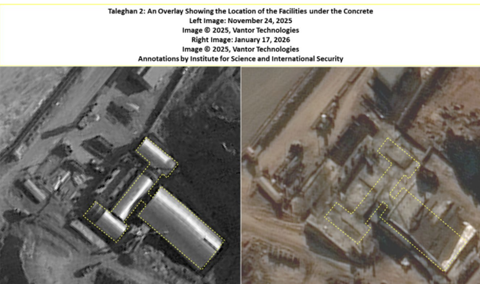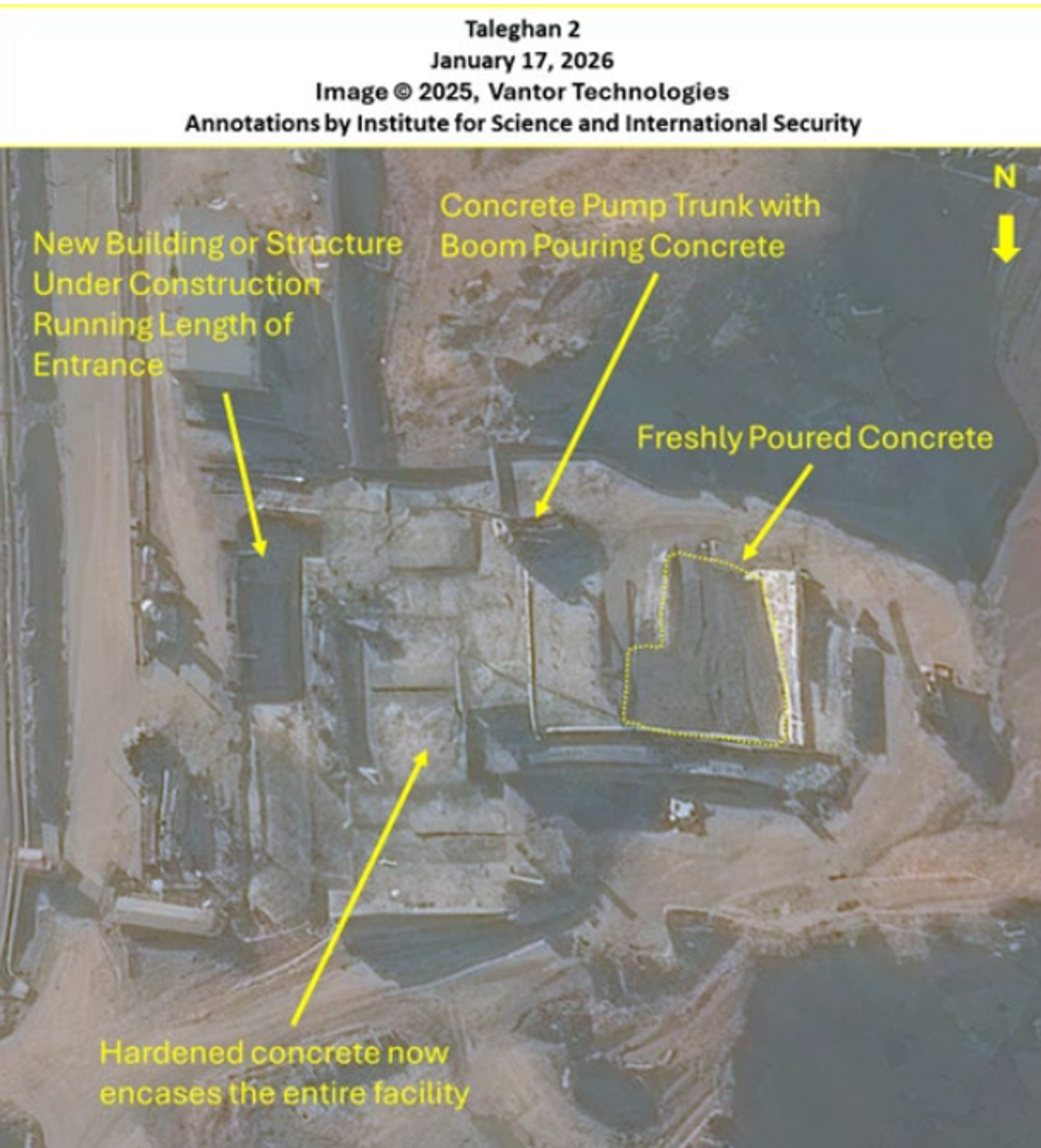 یک تصویر تطبیقی در این گزارش نشان میدهد محل سازههای دارای سقف قوسیشکل که در تصویر سمت چپ مربوط به ۲۴ نوامبر ۲۰۲۵ قابل مشاهده است، در تصویر سمت راست مربوط به ۱۷ ژانویه ۲۰۲۶ در زیر لایه بتنی قرار گرفته و تاسیسات اصلی اکنون بهطور کامل در زیر پوسته بتنی پنهان شده است.