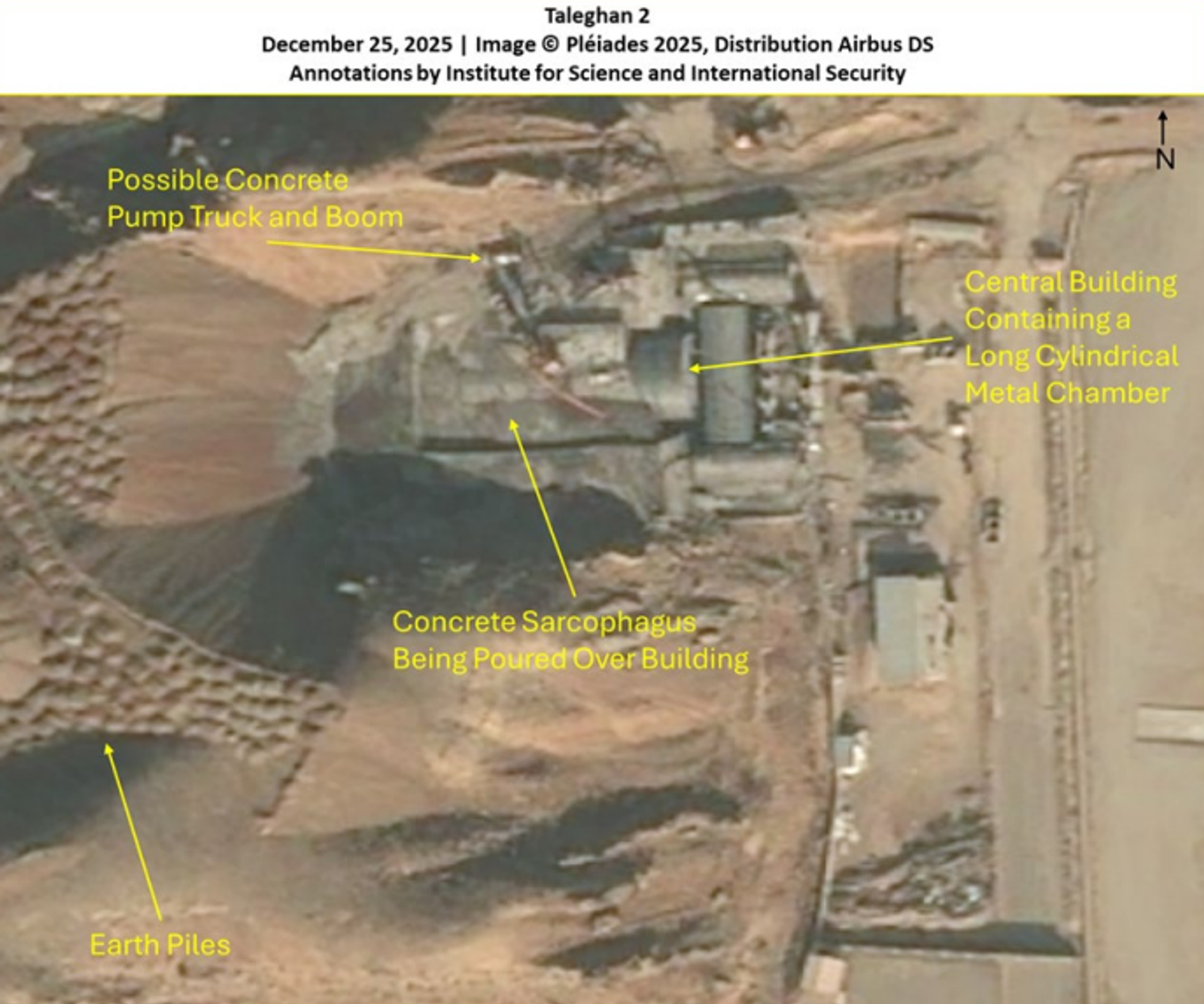 در بهروزرسانی پیشین تصاویر ماهوارهای که اوایل ژانویه ۲۰۲۶ منتشر شده بود، مشخص شد که تا ۲۵ دسامبر ۲۰۲۵، ساختمان اصلی طالقان ۲ با سقف فلزی قوسیشکل، که یک محفظه استوانهای شبیه به اتاق آزمایش مواد منفجره قوی را در خود جای داده، در حال پوشانده شدن با بتن است.