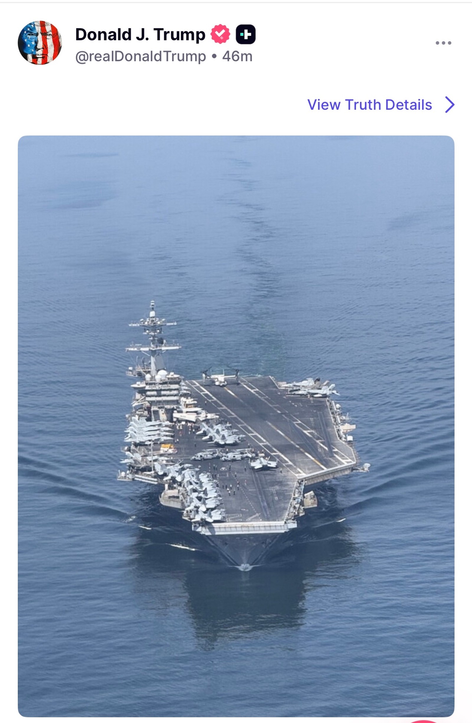دونالد ترامپ، رییسجمهوری ایالات متحده، عصر جمعه ۲۴ بهمن، ساعاتی پس از اینکه بار دیگر جمهوری اسلامی را تهدید کرد که در صورت توافق نکردن تبعات سنگینی در انتظارشان است، تصویری از بزرگترین ناو هواپیمابر آمریکا را در حساب تروث سوشال خود بدون هیچ توضیحی منتشر کرد.