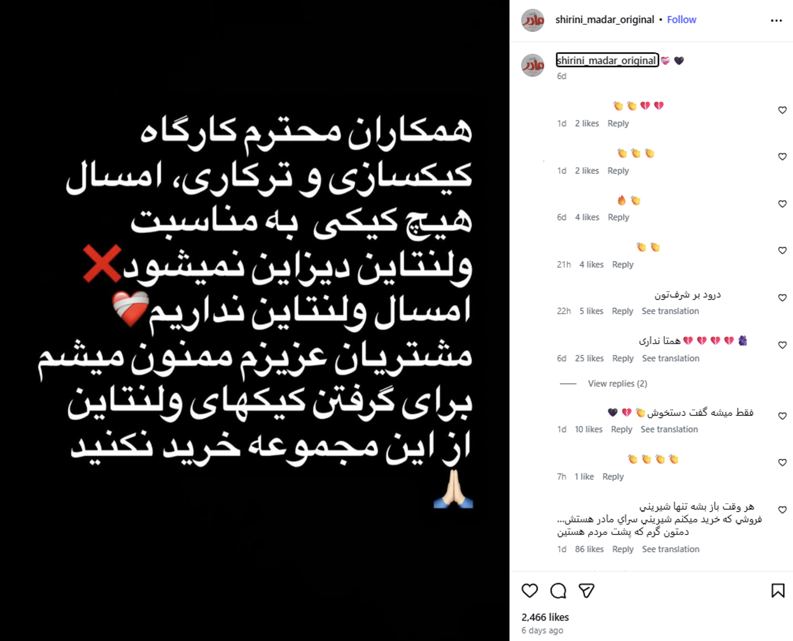 شیرینی‌فروشی مادر ۲۲ بهمن با انتشار تصویری از یک متن بر پس‌زمینه‌ سیاه در شبکه اجتماعی اینستاگرام، خطاب به مشتریانش نوشت: «امسال هیچ کیکی به مناسبت ولنتاین دیزاین نمی‌شود. امسال ولنتاین نداریم.»