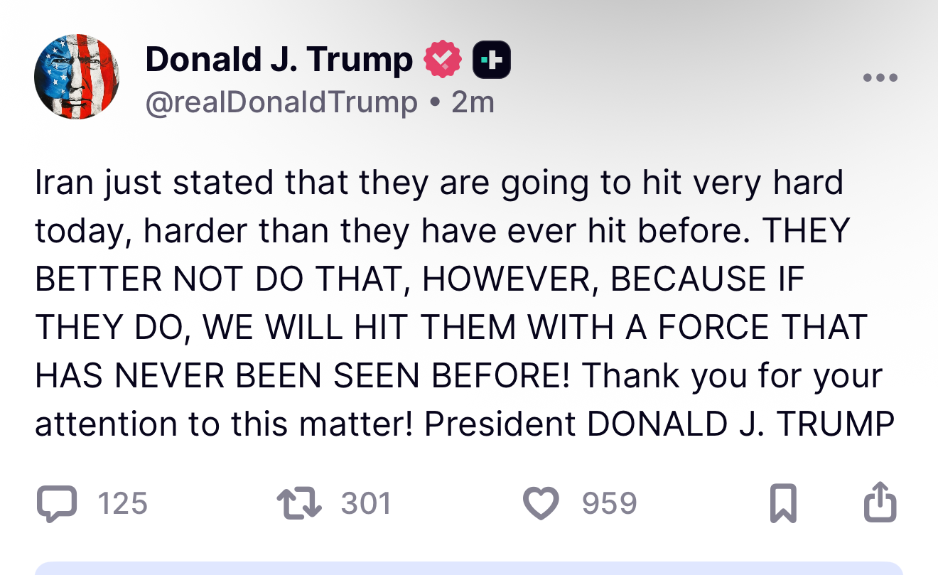ترامپ پیشتر در تروث سوشال نوشته بود: «ایران اعلام کرده امروز بهشدت حمله خواهد کرد، شدیدتر از هر زمان دیگری. با این حال، بهتر است چنین کاری نکنند، زیرا اگر این کار را انجام دهند، ما با نیرویی به آنها ضربه خواهیم زد که هرگز پیش از این دیده نشده است.»