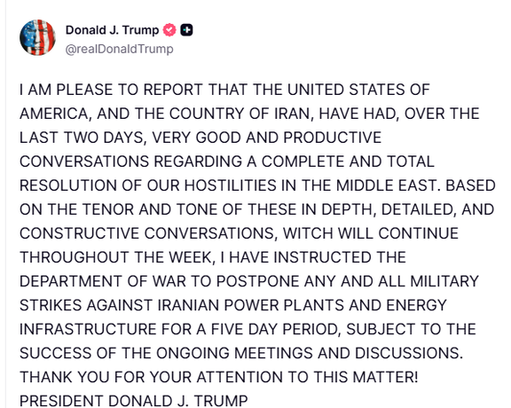 دونالد ترامپ، رییسجمهوری آمریکا، از مذاکرات «سازنده» با تهران خبر داد و اعلام کرد هرگونه حمله به نیروگاهها و زیرساختهای انرژی ایران به مدت پنج روز به تعویق خواهد افتاد. در سوی دیگر، وزارت خارجه جمهوری اسلامی و رسانههای وابسته به سپاه گفتوگو با واشینگتن را تکذیب کردند.