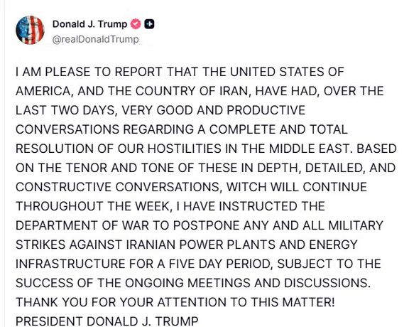 رییسجمهوری آمریکا، ساعاتی پیش از گفتوگو با خبرنگاران با انتشار پستی در شبکه اجتماعی خود، تروثسوشیال، از مذاکرات «سازنده» با تهران خبر داده و اعلام کرده بود هرگونه حمله به نیروگاهها و زیرساختهای انرژی ایران به مدت پنج روز به تعویق خواهد افتاد.